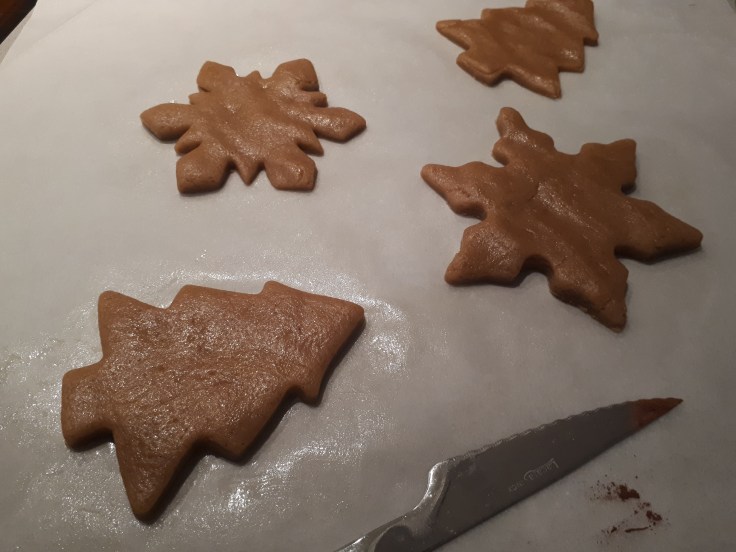 -con la ayuda de cortadores, le damos forma. Reservamos un poco de masa y la mezclamos con cacao y así podemos decorar algunas de nuestras galletas