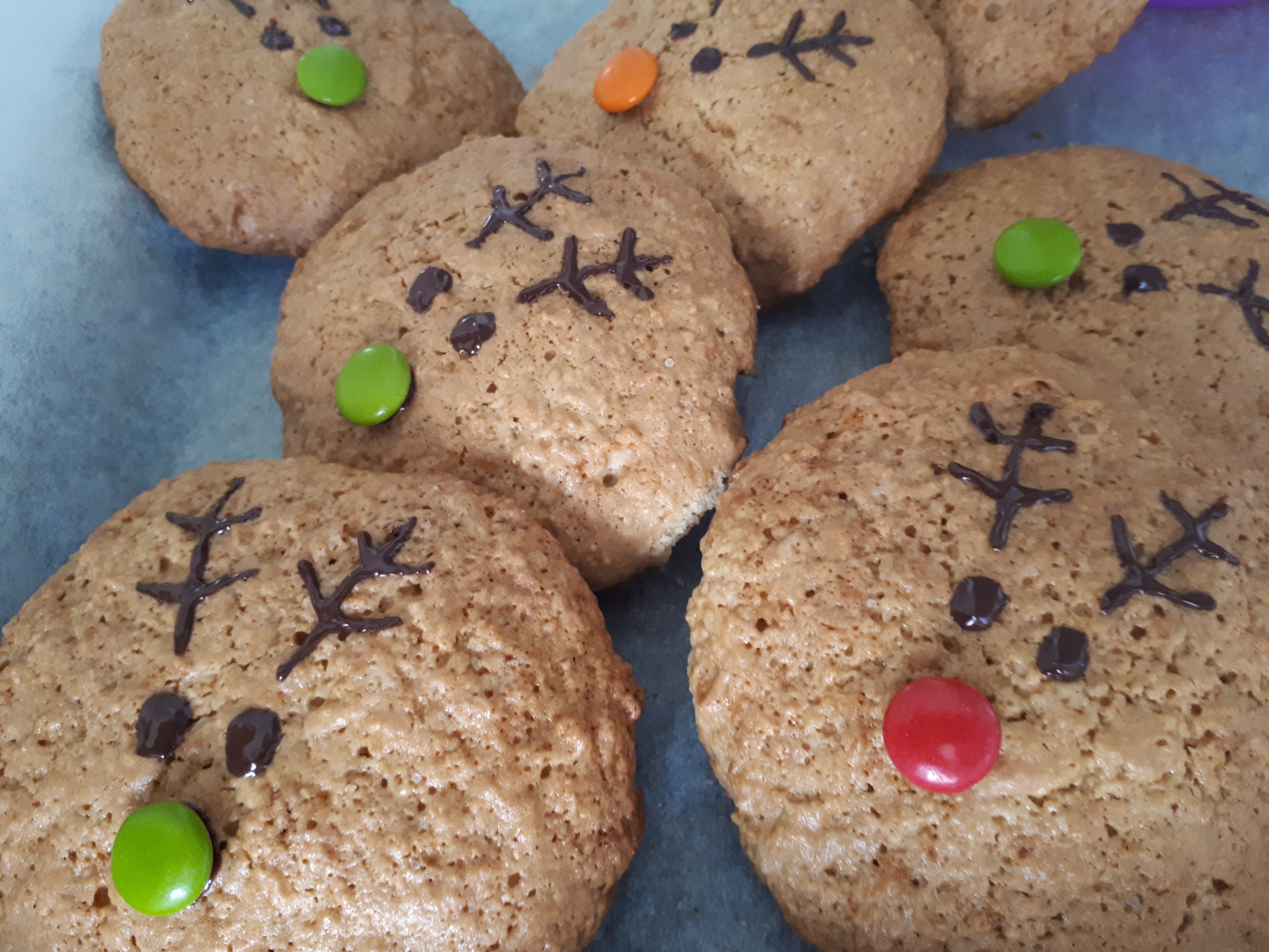 En estas fechas, me apetece preparar recetas navideñas y una que no puede faltar son las galletas. Ya hace tiempo que vi por Internet estas de reno y esta semana me he decidido a prepararlas. Como no hay que darle forma, que tan solo es un círculo, la masa la he hecho con harina de bizcocho y huevo, así quedan blanditas y esponjosas por dentro y tostaditas por los bordes.