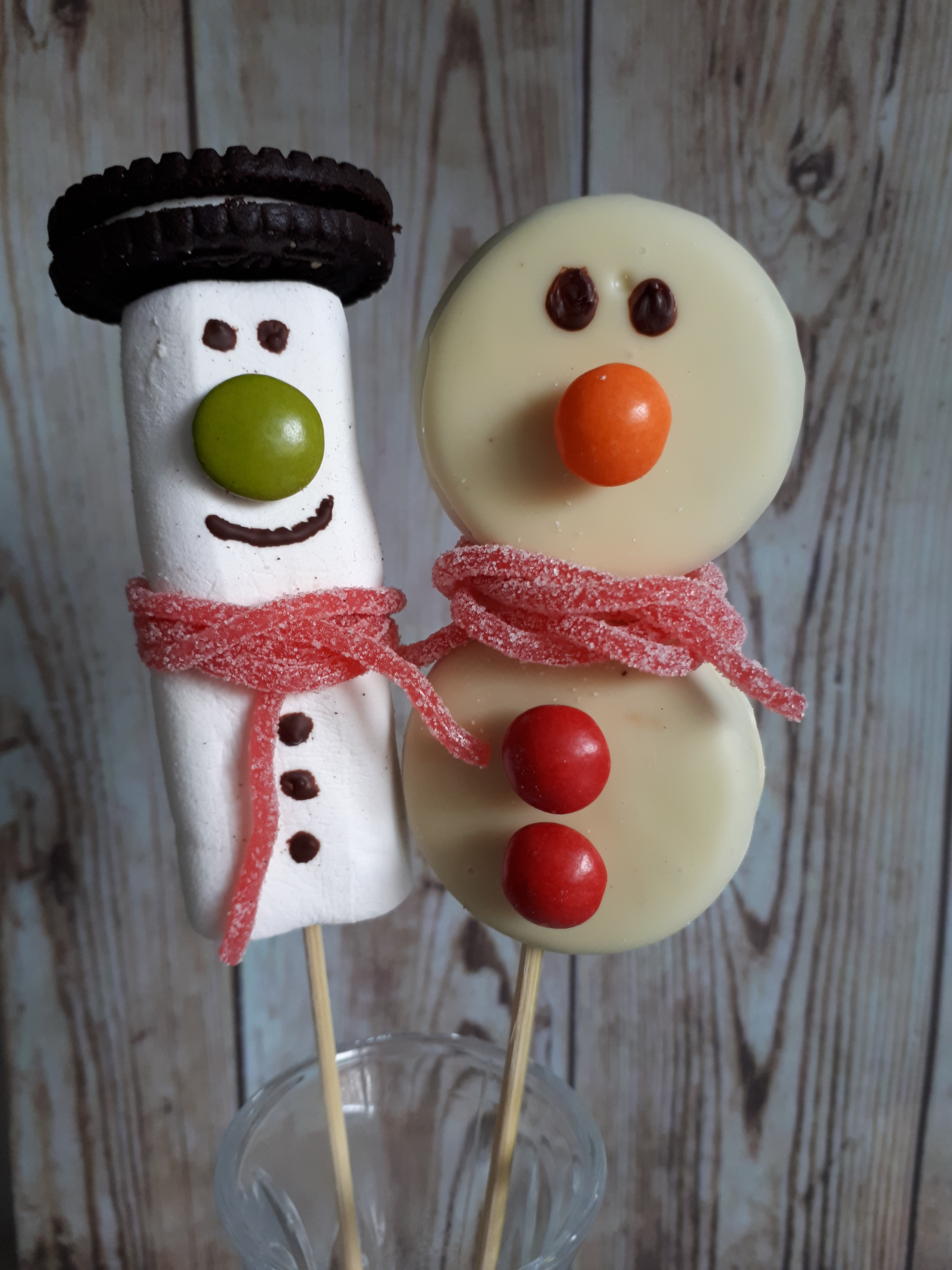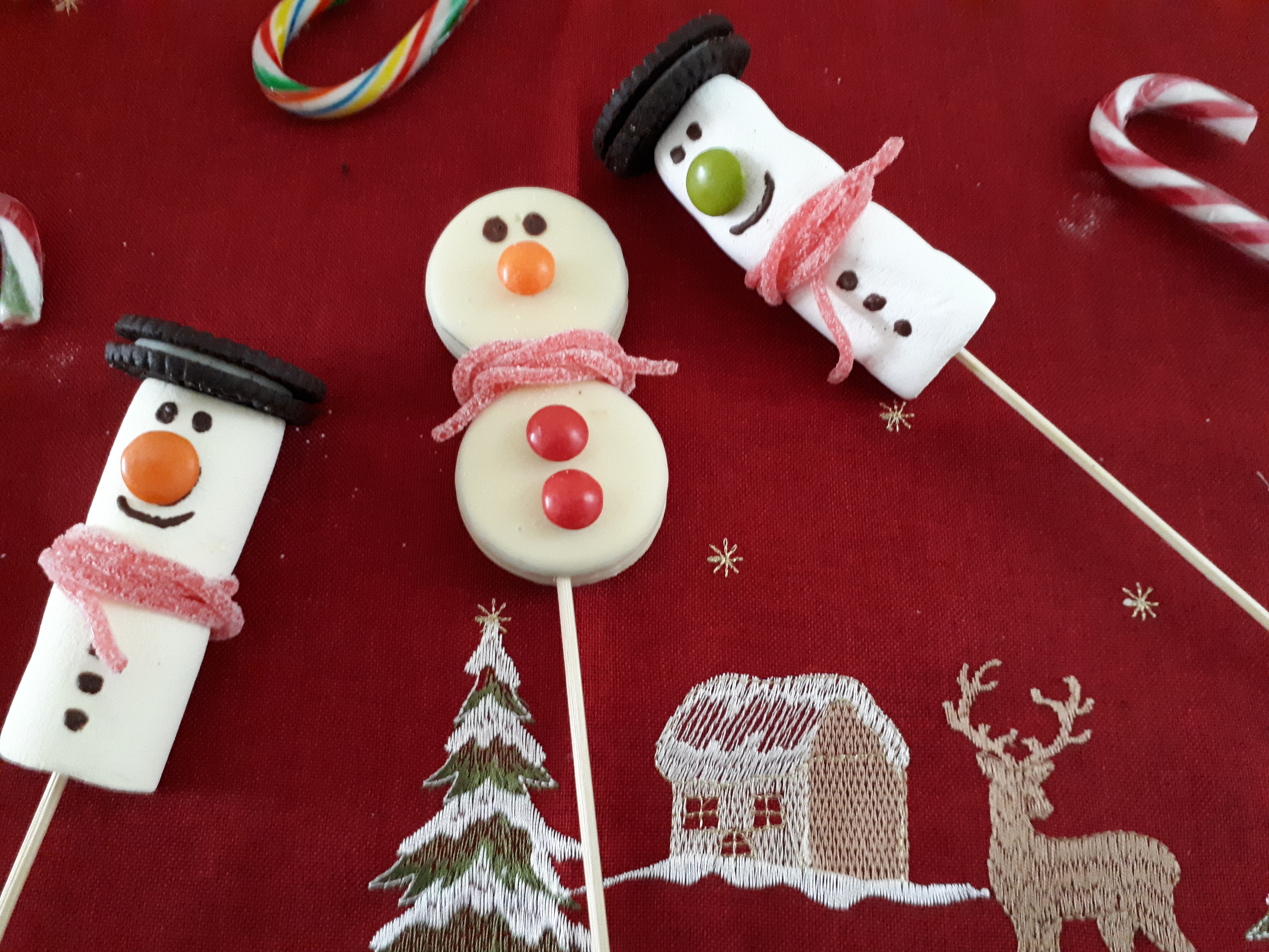 Estos muñecos de nieve son una idea fácil y original para hacer en casa en estas fechas navideñas. Las recetas las vi en Pinterest y me encantaron; he hecho un par de muñecos antes de prepararlos para la familia cuando vengan a casa estas fiestas. Uno de ellos está hecho con nubes y el otro con galletas Oreo bañadas en chocolate blanco. Para decorarlos, he utilizado chocolate negro, Lacasitos, Oreo y tiras de gominola. Una idea rápida y sencilla para decorar la mesa y acompañar el postre, que espero que guste a grandes y pequeños.