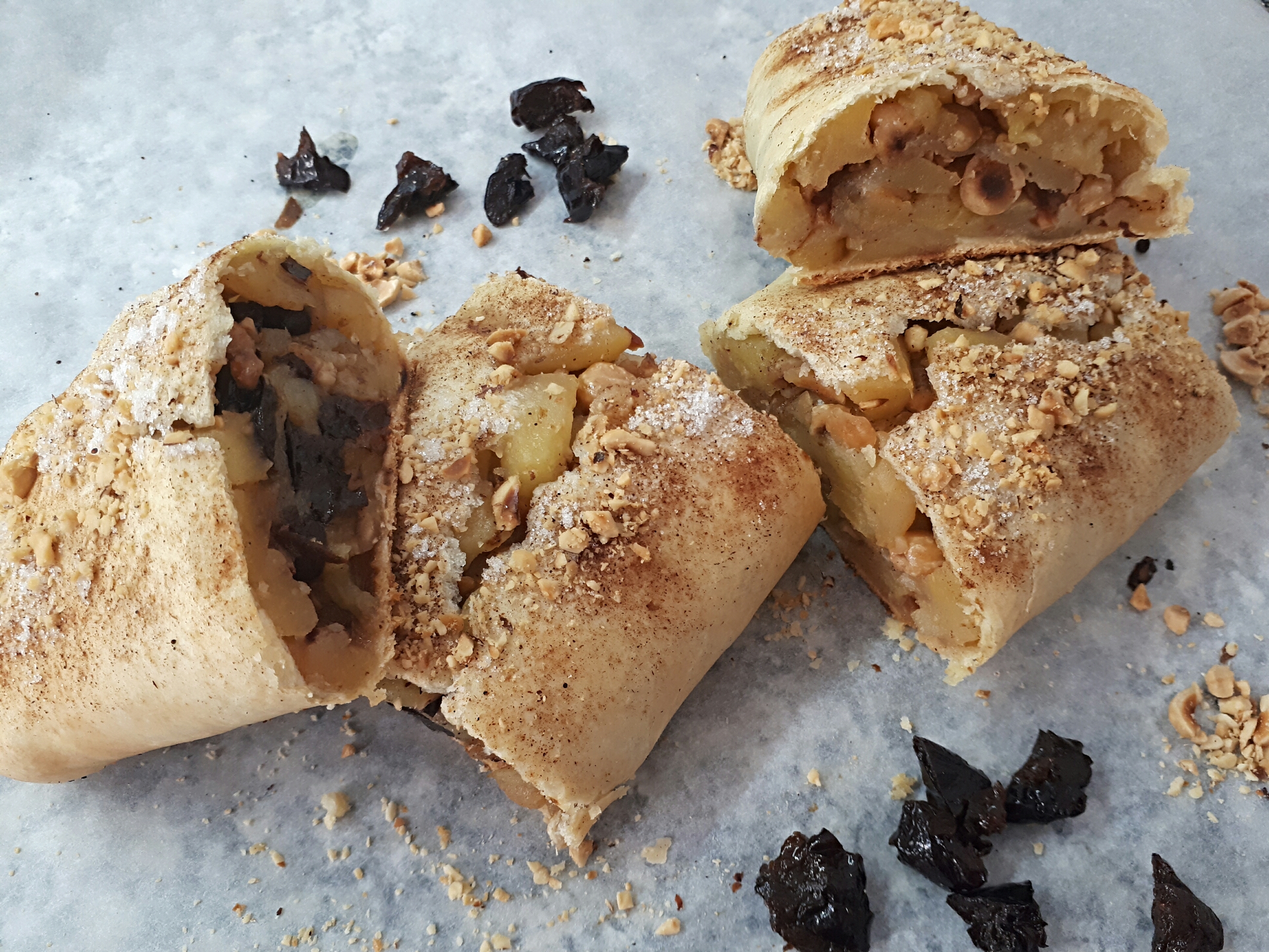 Este strudel de manzana y avellanas que preparamos mi madre y yo fue un postre un poco improvisado. Cuando nos juntamos el domingo para comer, a nosotras nos gusta encargarnos del postre y preparar algo para acabar de redondear una buena comida. Esta vez, no queríamos enredarnos mucho y decidimos hacer nuestra propia versión de este pastel originario del Imperio Austrohúngaro y que se asocia a la cocina alemana, austríaca e italiana. Lo preparamos muy rápido, ya que utilizamos una lámina de hojaldre y tan solo preparamos el relleno con los ingredientes que teníamos en casa. El resultado fue espectacular y decidimos repetir, así que ha sido el postre de fin de año.