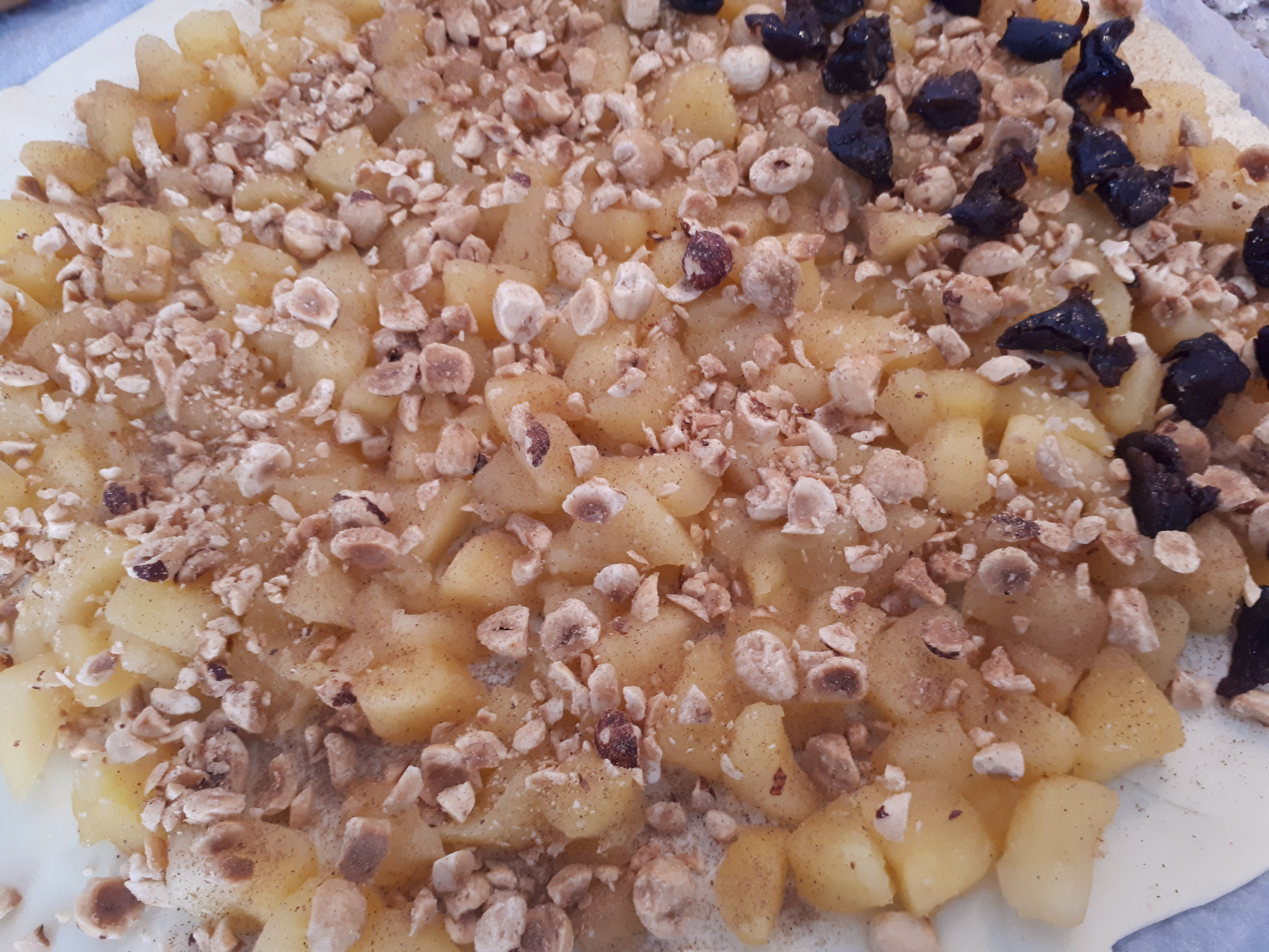 -mezclamos las manzanas troceadas con las avellanas picadas y la fruta desecada y extendemos la mezcla por toda la lámina de hojaldre (que hemos estirado previamente)