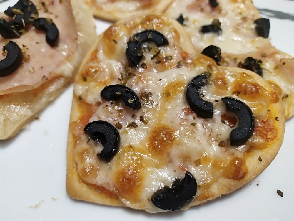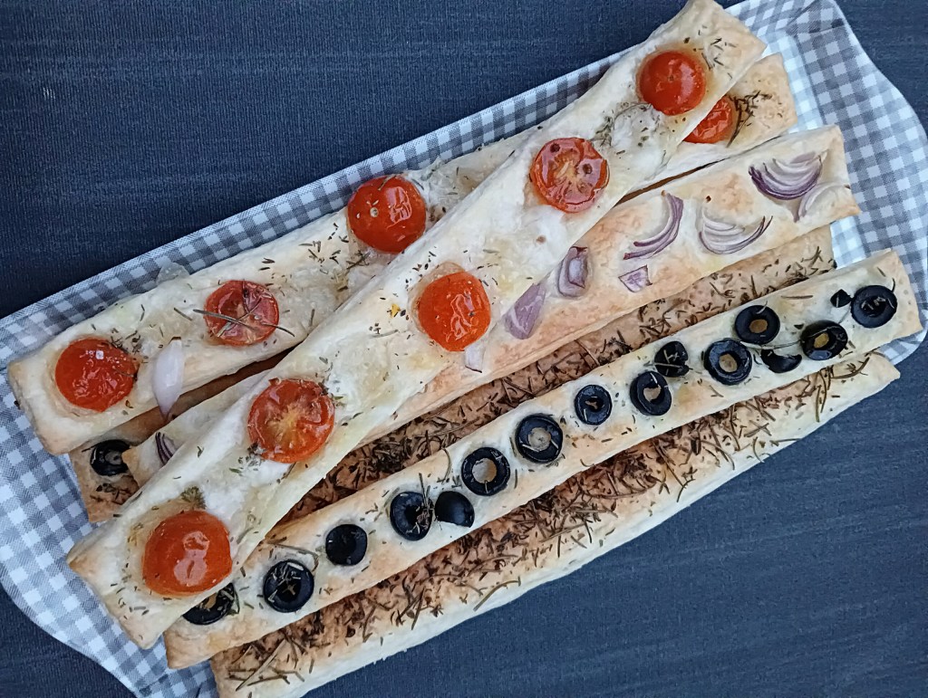 Siempre que voy a comer al restaurante La Tagliatella me pido de entrante unos panecillos de sabores que hacen y me encantan. Los he querido preparar en casa con una masa de hojaldre que tenía. Es tan sencillo como cortar la lámina en tiras de unos dos dedos de ancho, pintarlas con aceite y luego añadir por encima los ingredientes que queramos. Yo he hecho dos de tomates cherry y mozzarellas, dos de cebolla, dos de hierbas provenzales y dos de olivas negras. Todas las las he acabado con un poco más de aceite, un poquito de hierbas y sal gorda. Luego hay que hornearlas y ya están listas para comer.