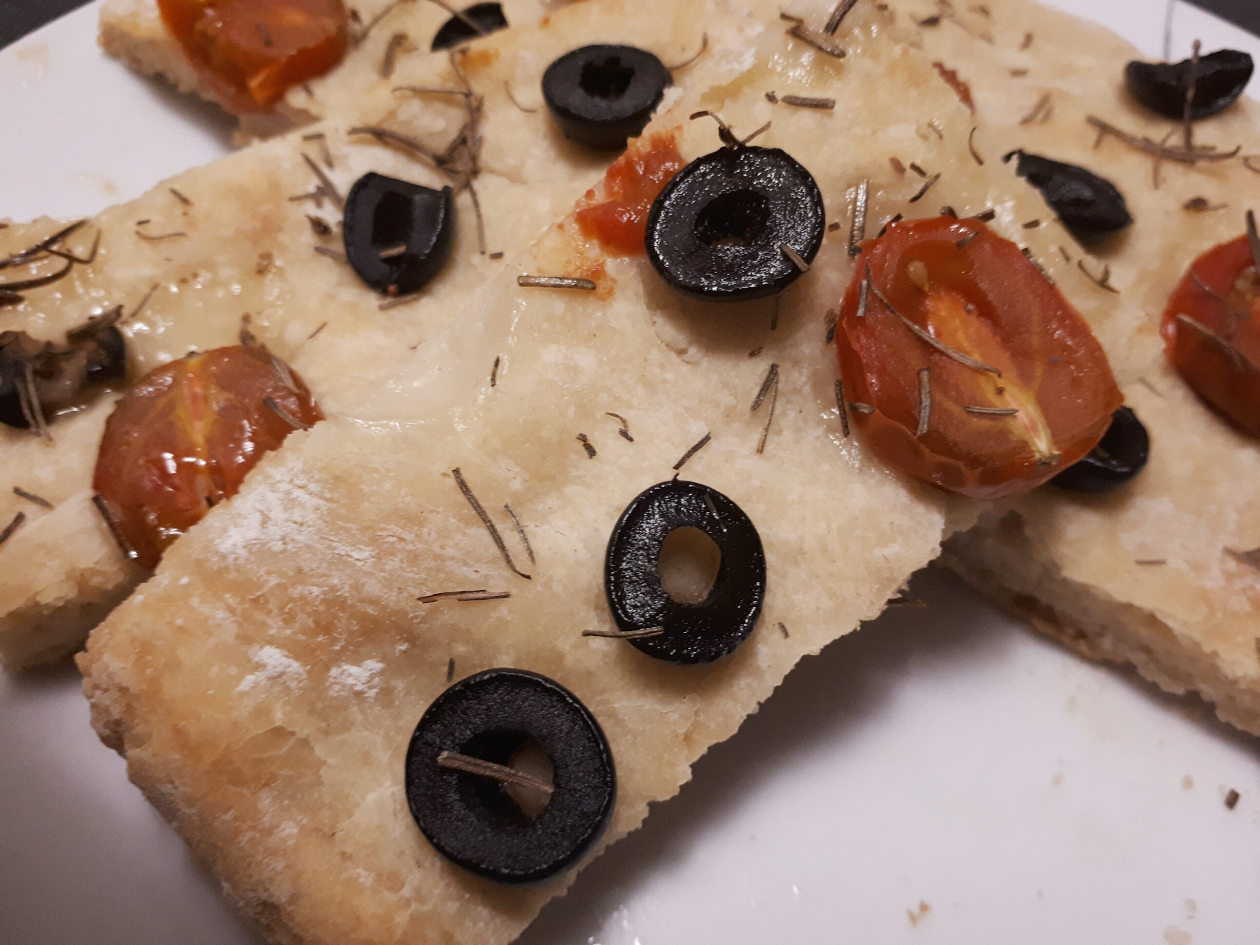 La otra noche para cenar preparamos focaccia con romero, tomates y olivas y la acompañamos con embutido. Nos gustó tanto que hemos repetido en casa de mis padres, para comer los cuatro. Es una especie de pan plano cubierto con hierbas u otros ingredientes. Se puede aliñar con lo que más nos guste o con lo que tengamos en casa.
