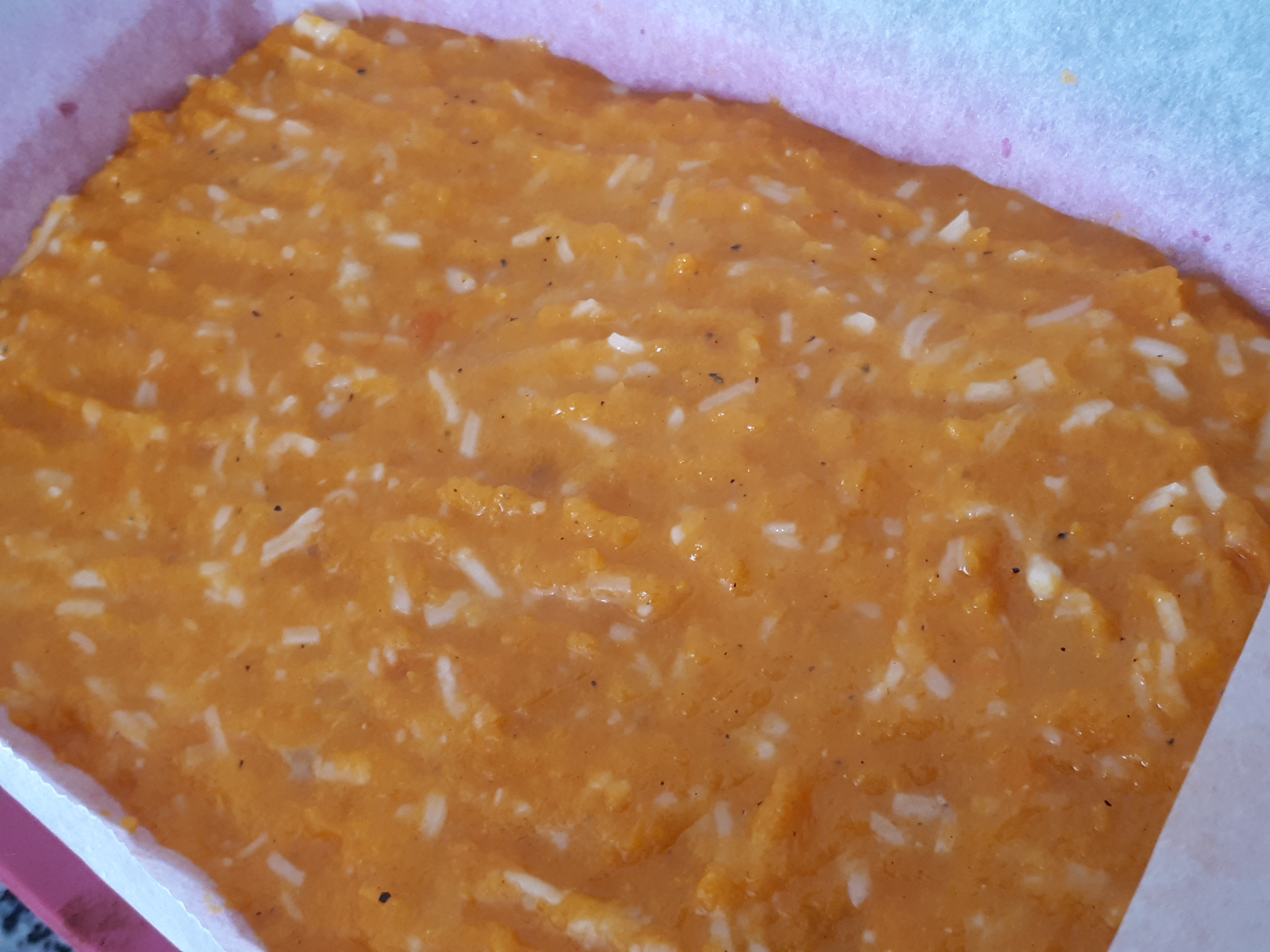 -colocamos la mezcla en un molde (yo lo forro con papel de horno para que sea más fácil de desmoldar y no se pegue). En esta ocasión, he vertido la mitad de la masa, le he añadido una capa de mozzarela y encima he incorporado el resto la masa, así a la hora de cortar se ven las capas