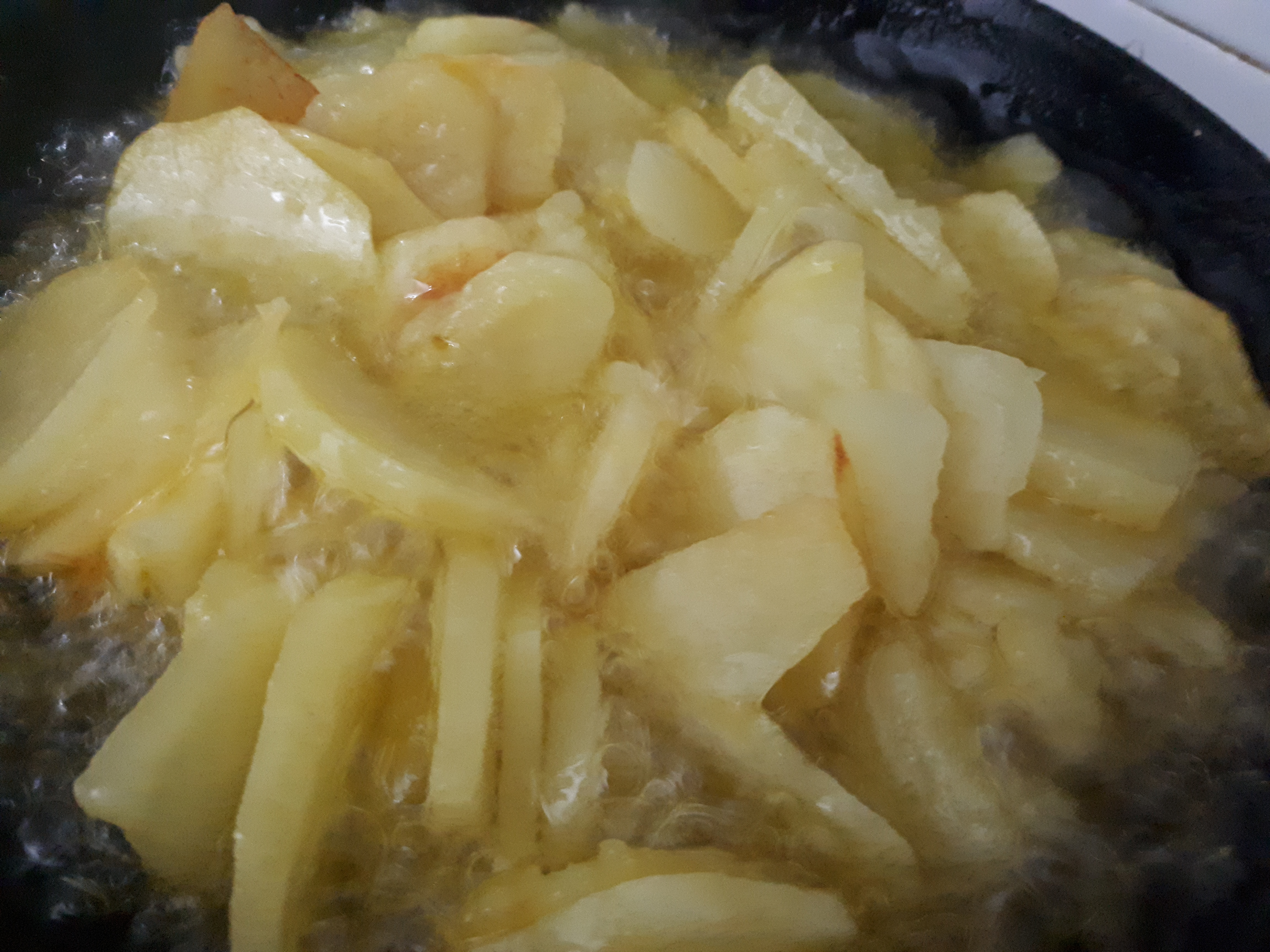 -primero freímos en una sartén las patatas a fuego lento hasta que veamos que están doraditas y las retiramos