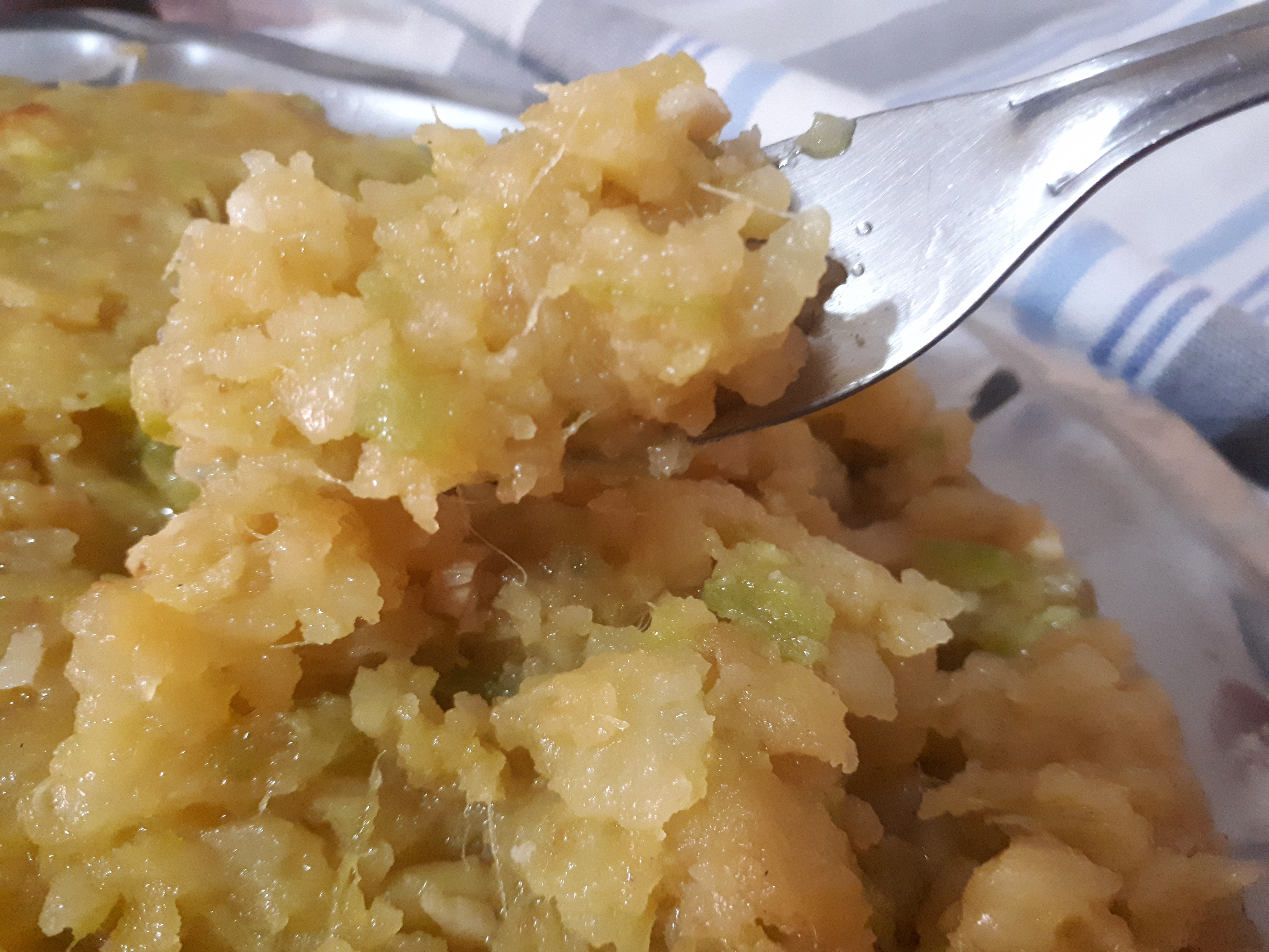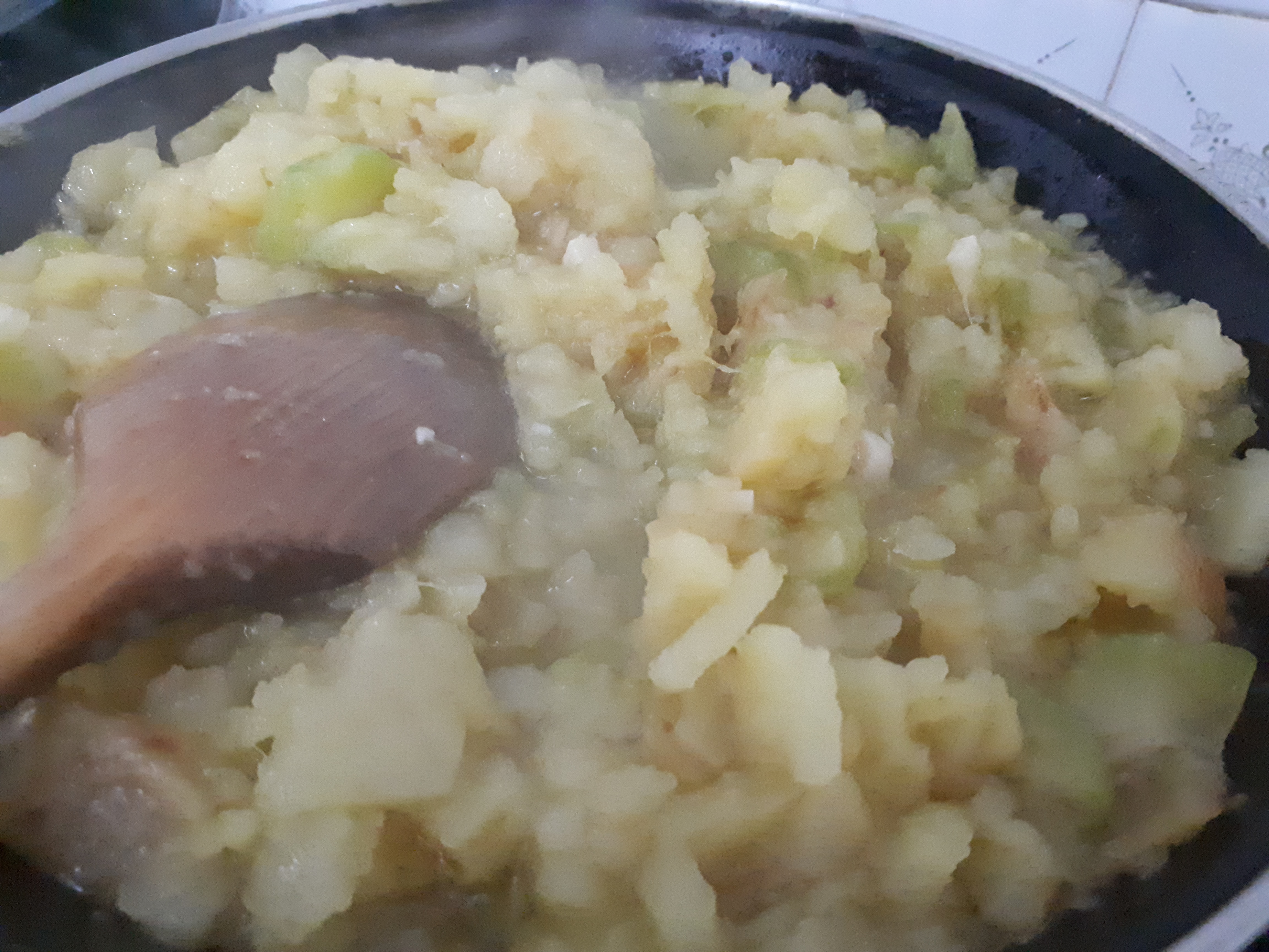 -cuando el calabacín esté hecho, añadimos en la sartén las patatas que habíamos preparado y juntamos los dos ingredientes. Vamos mezclando y chafando la mezcla con la paleta para que quede un revuelto