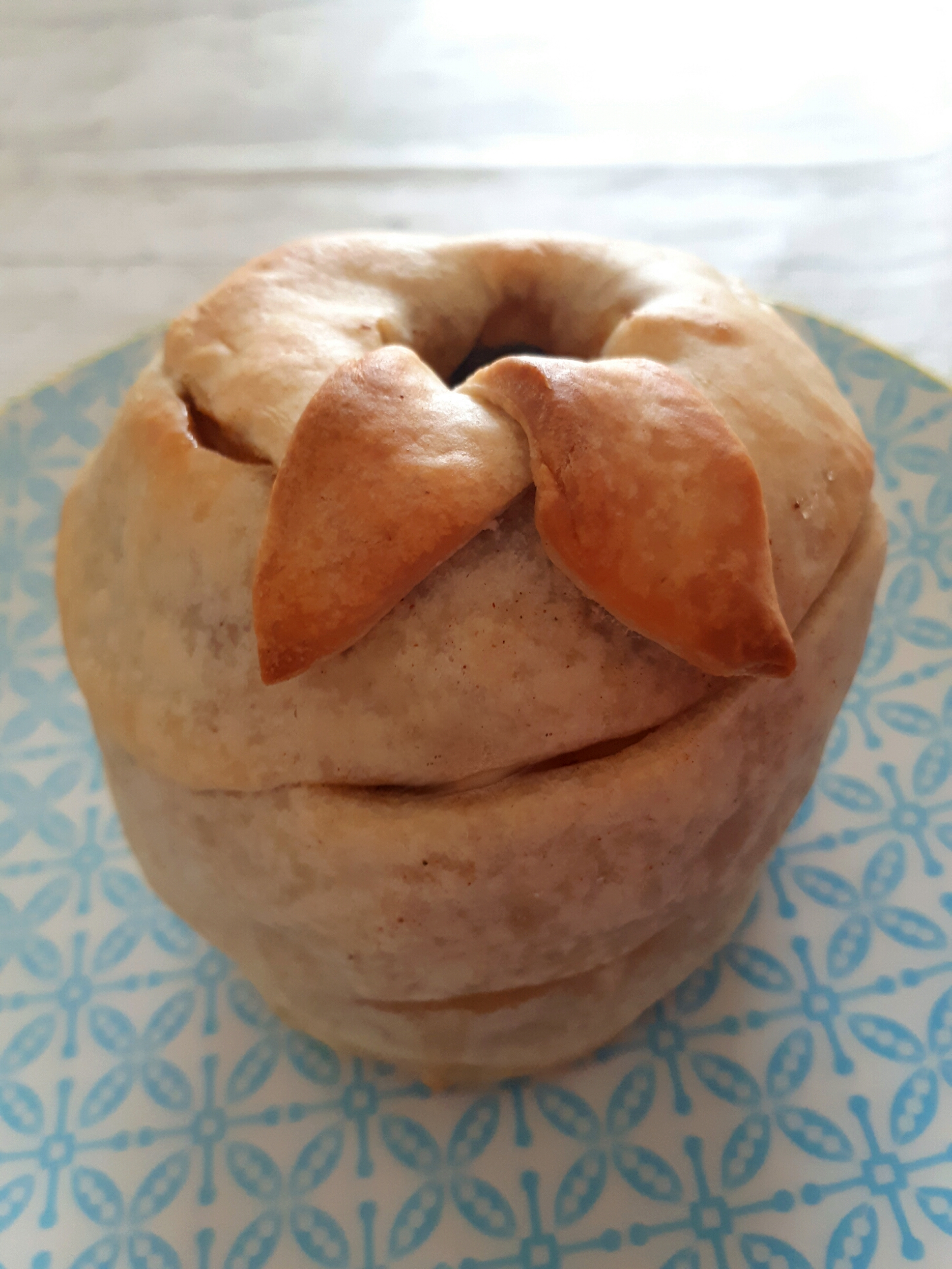 En casa nos encantan las manzanas y siempre que tenemos ocasión, preparamos postres con esta fruta, que da mucho juego en la cocina. Este volcán de chocolate que cuelgo hoy es una receta que vi por Instagram y me la guardé. Compré una lámina de masa quebrada y preparé este postre el fin de semana. En el corazón lleva un trozo de chocolate, que al calentarse en el horno, a la hora de cortar la manzana para comer, está derretido. La manzana está rebozada de azúcar moreno y canela y está cubierta con masa quebrada. La combinación es perfecta, es un postre suave y original, muy recomendable.