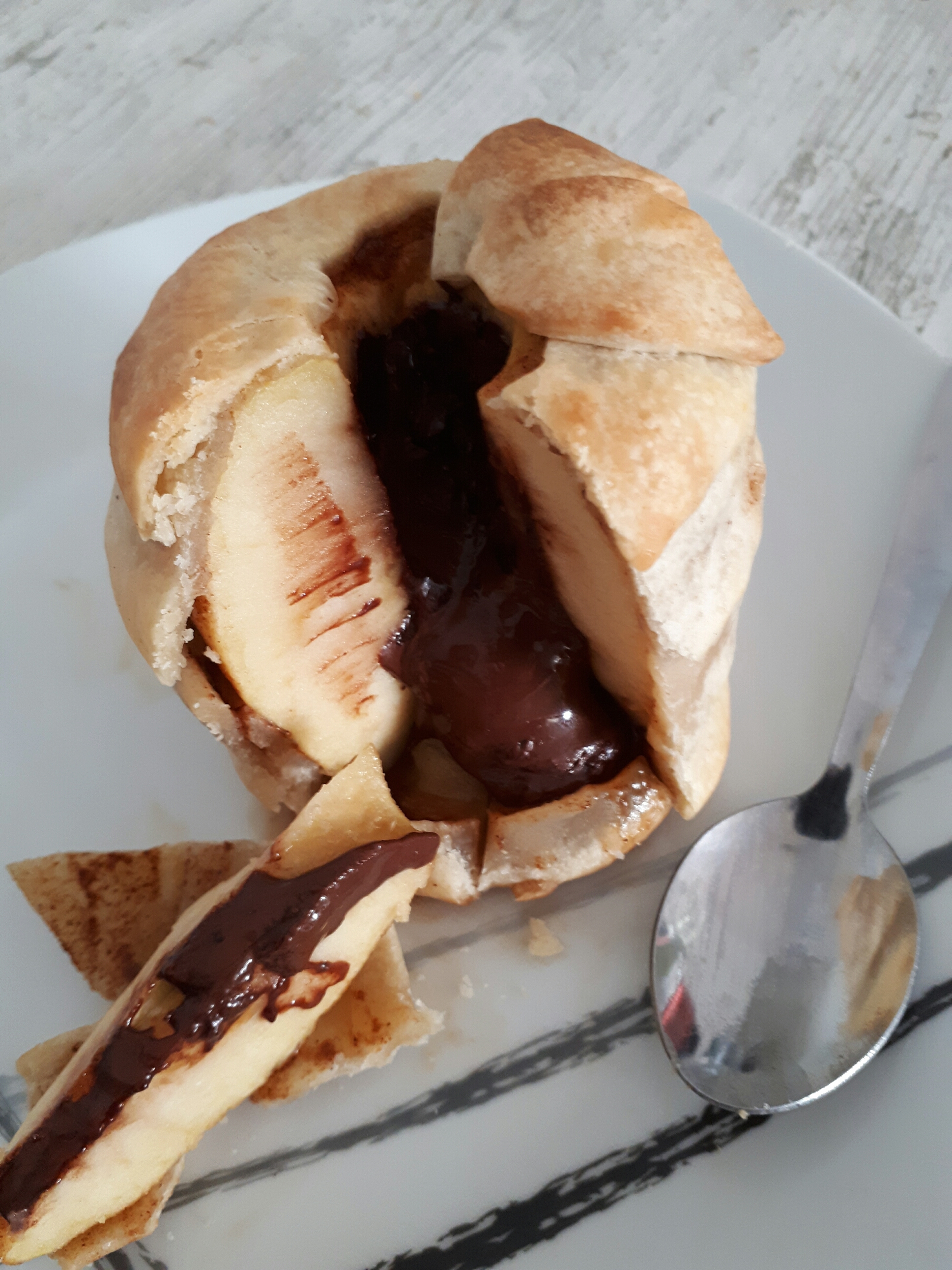 -llevamos las manzanas al horno (a 170 grados) durante unos 30 minutos aproximadamente, hasta que veamos que la masa quebrada está dorada. Las manzanas estarán blanditas y el chocolate se habrá derretido