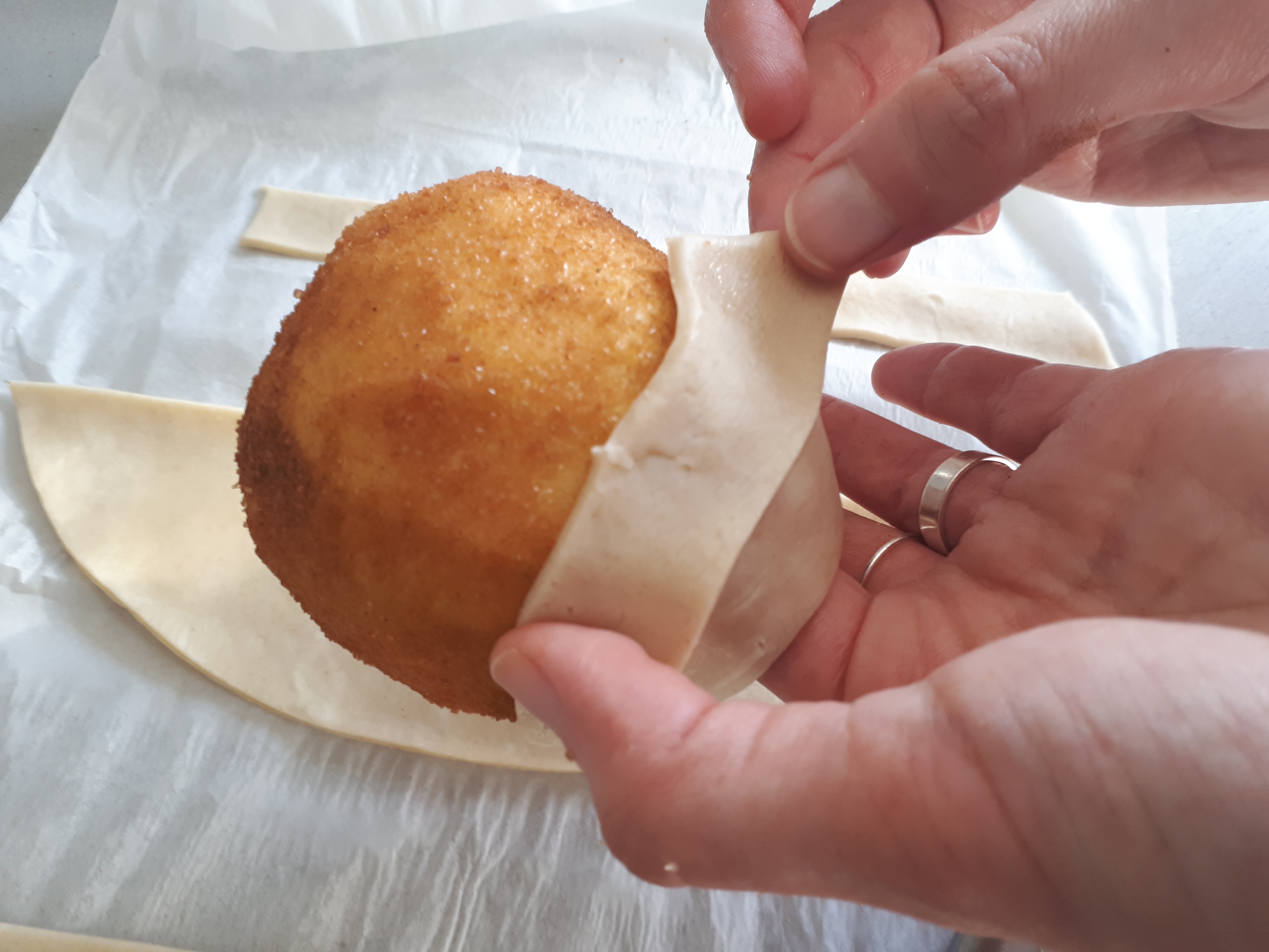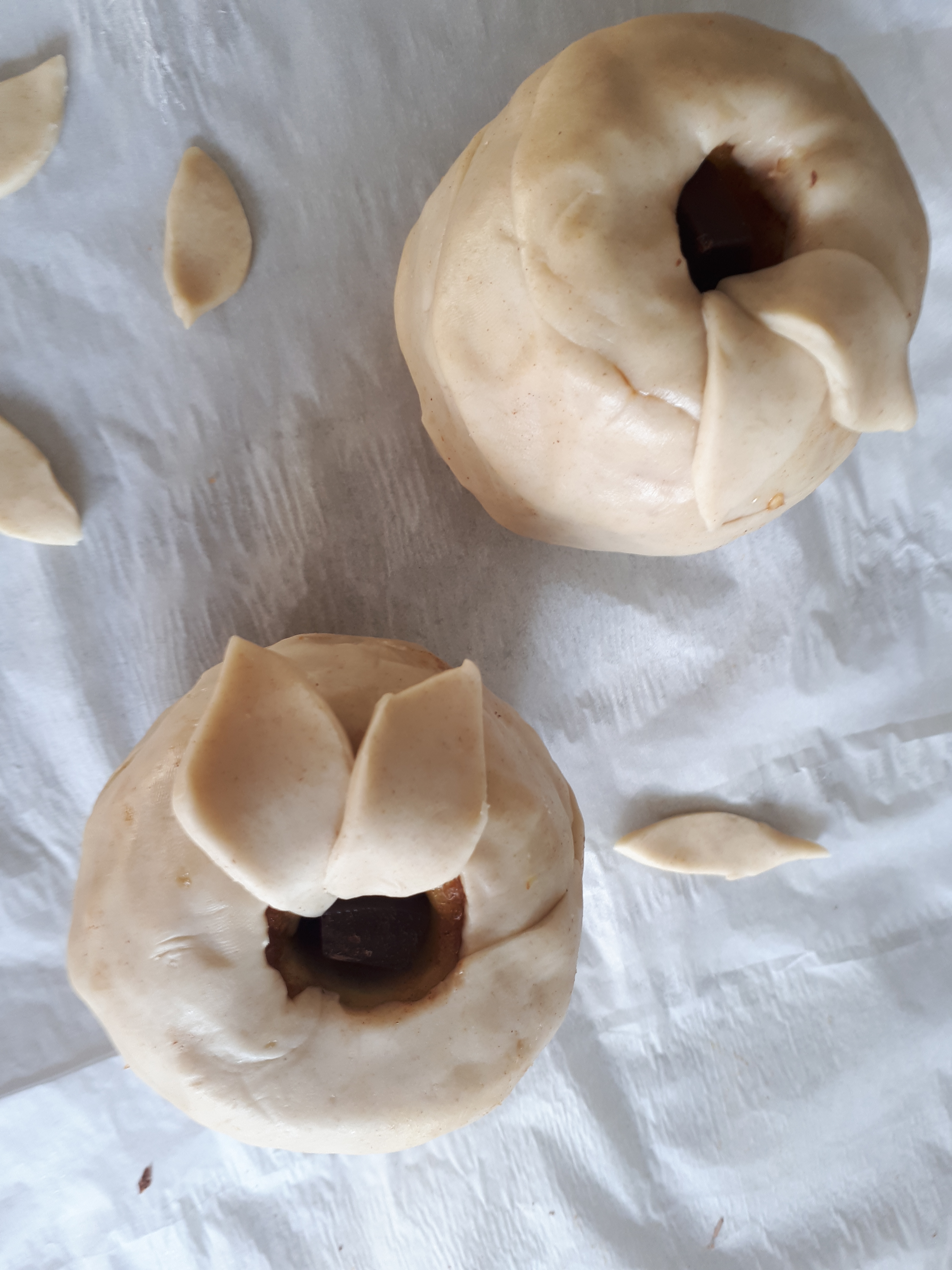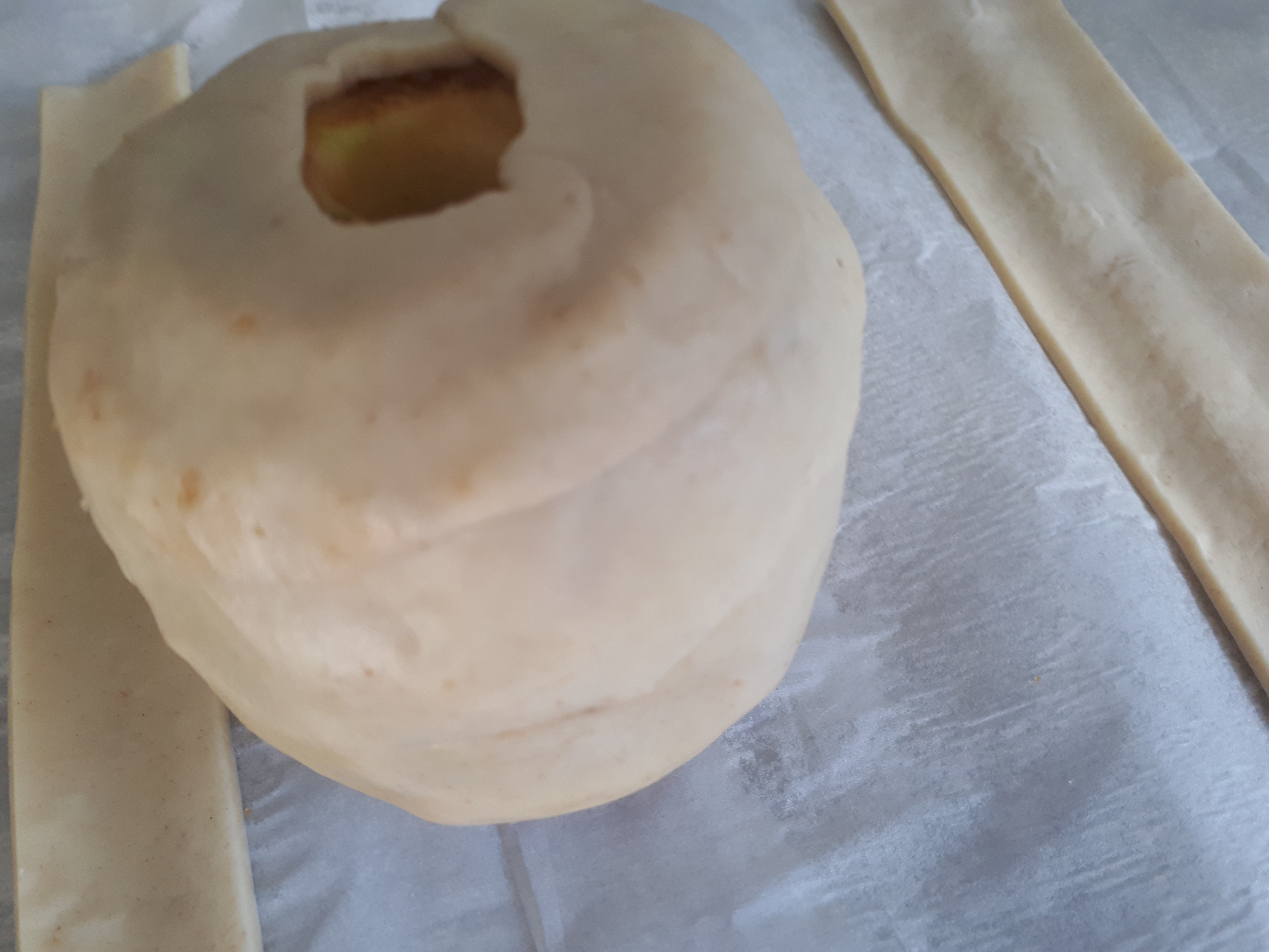 -cortamos la lámina de masa quebrada en tiras finitas, que utilizamos para cubrir la manzana. Empezamos por abajo y vamos subiendo. En el agujero de la parte inferior, colocamos un poco más de masa para que luego el chocolate no se salga