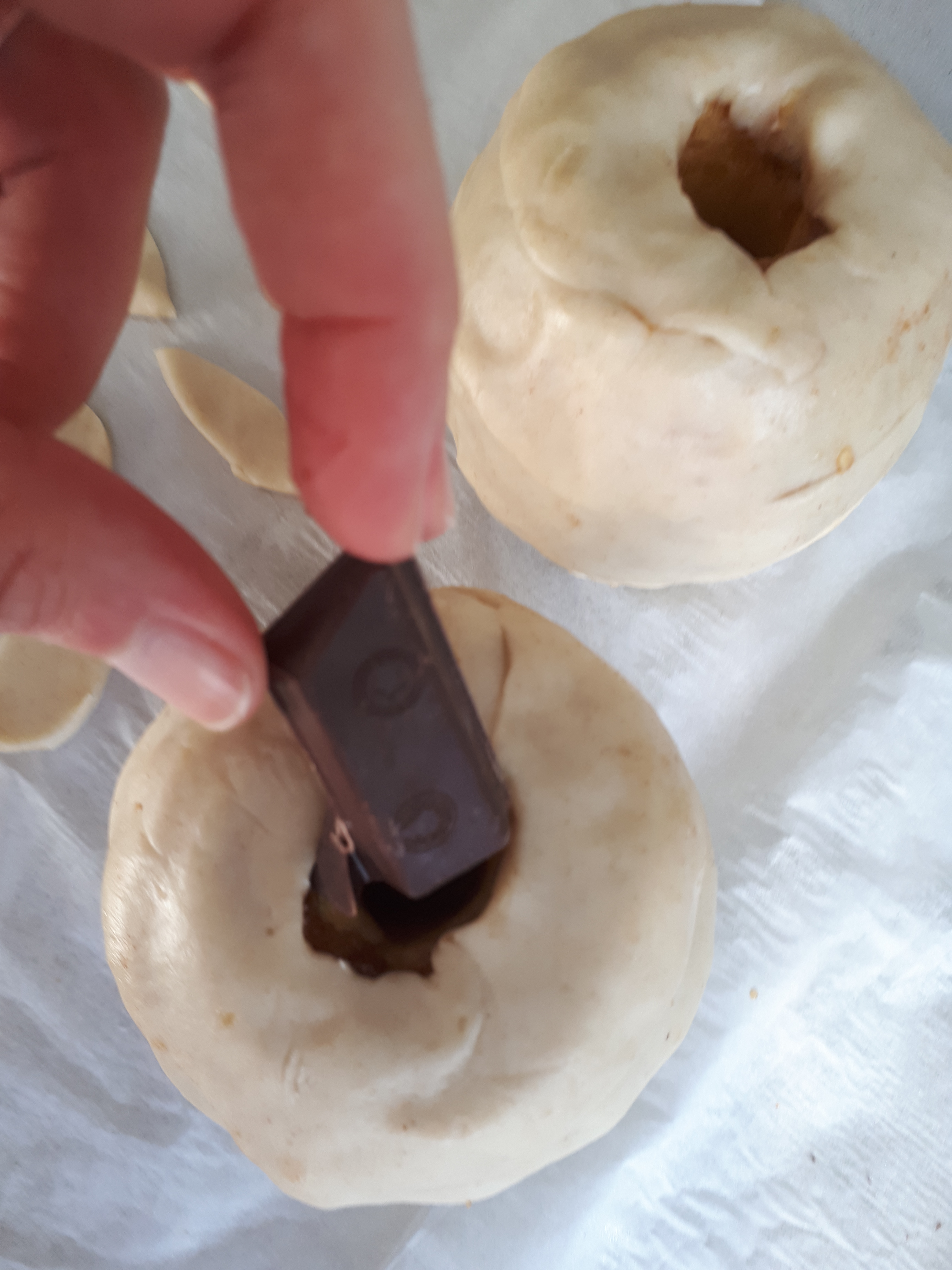 -por último, por el agujero superior, introducimos un trozo de chocolate