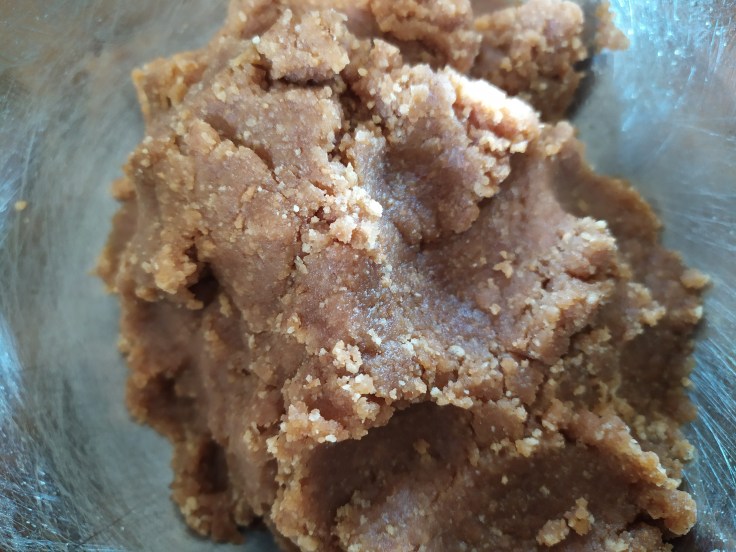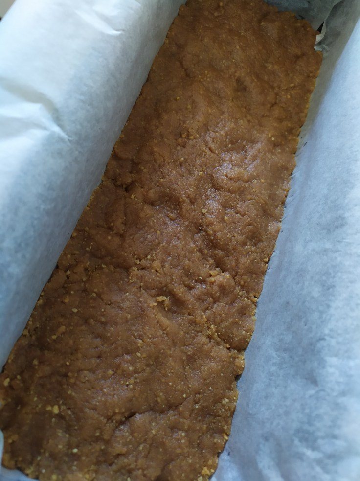 -mezclamos los dos ingredientes hasta obtener una base consistente y la extendemos en el molde con las manos hasta que cubra toda la base. Dejamos enfriar en la nevera