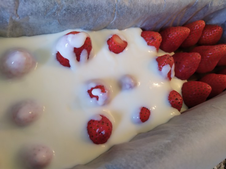 -colocamos las fresas sobre la base de galleta que habíamos preparado, dejando espacio entre ellas y volvemos a dejar en la nevera