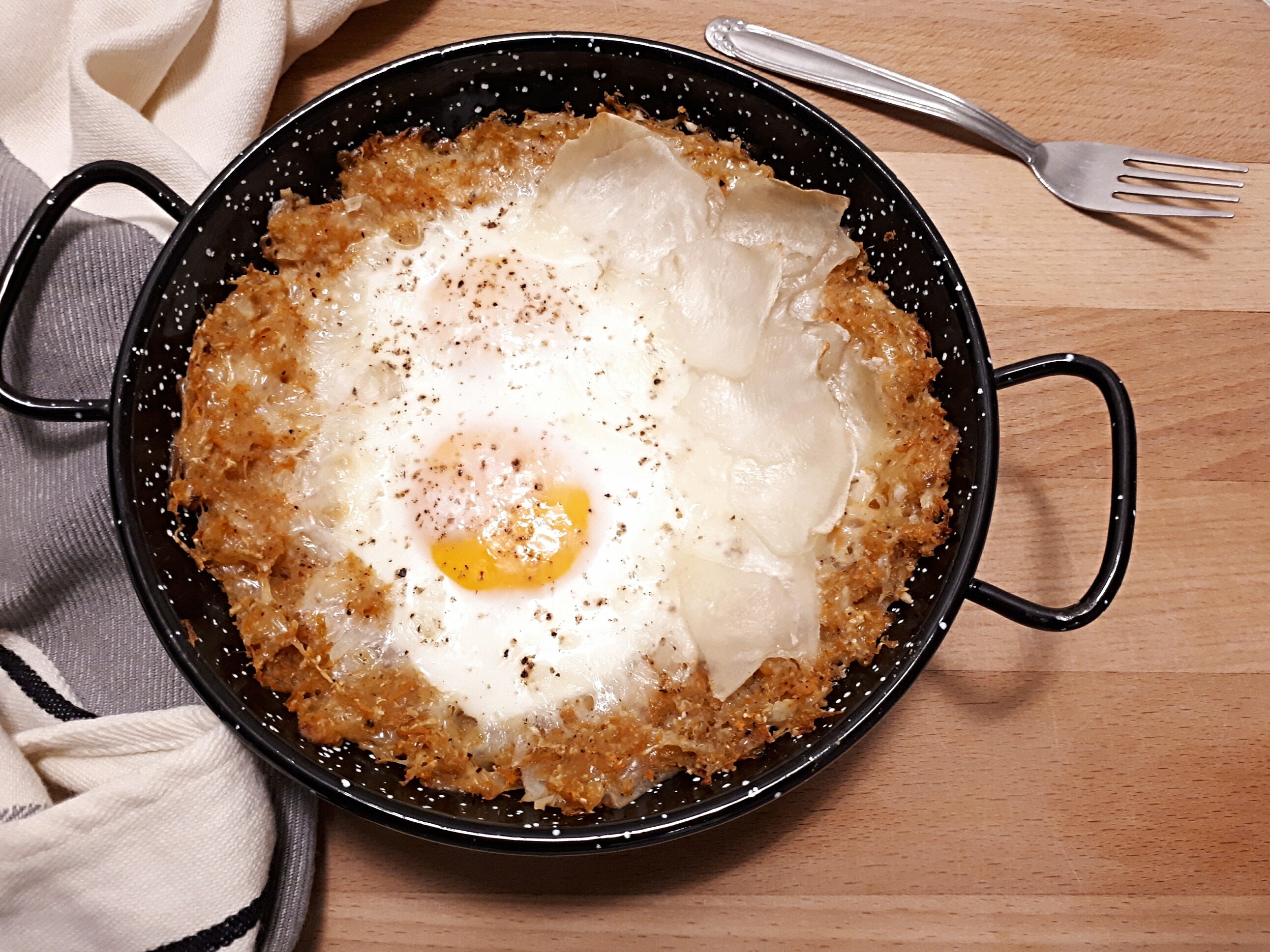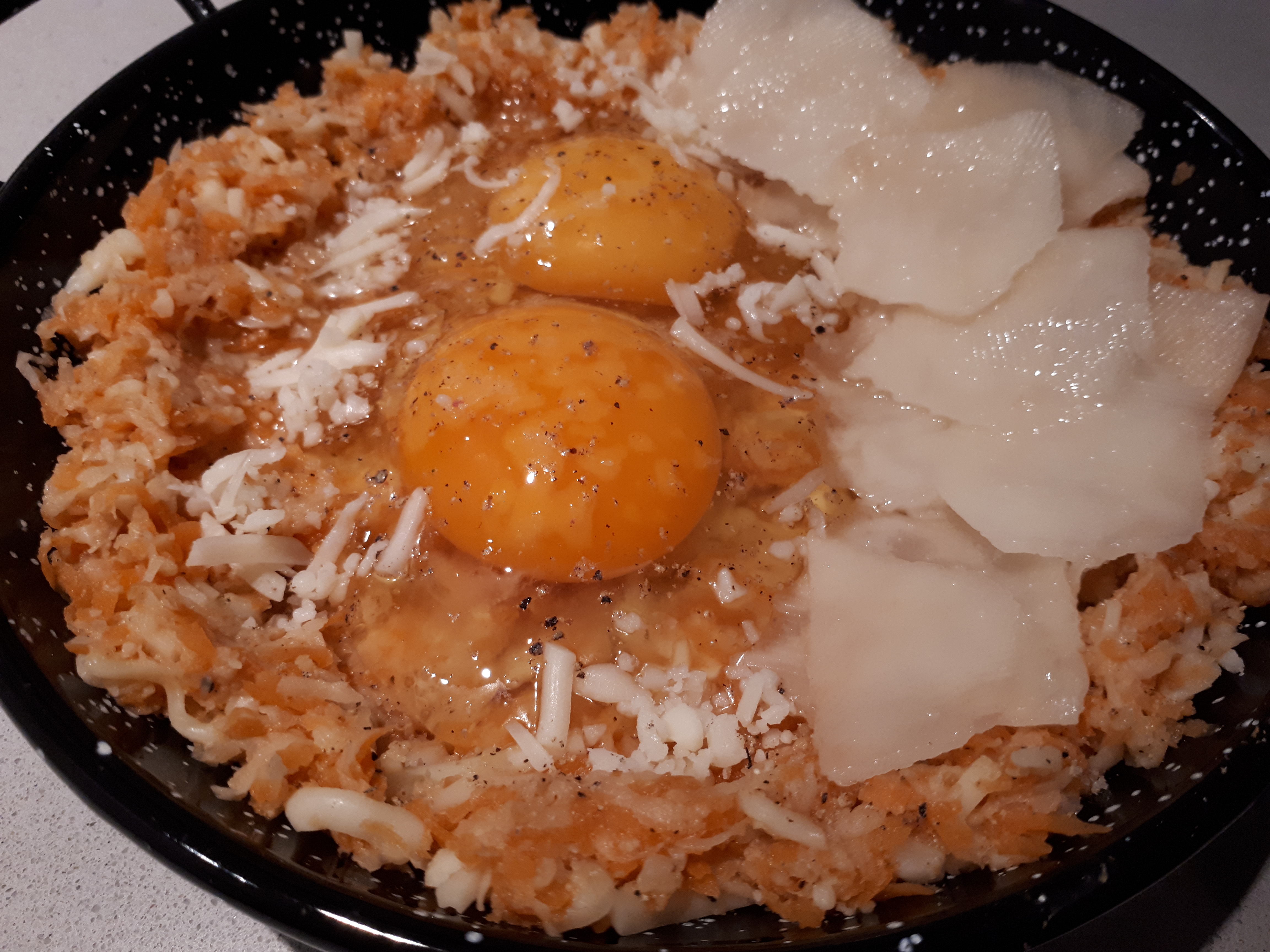 -colocamos un huevo en el centro y lo aliñamos. Podemos colocar por encima los trocitos de patata que hemor cortado antes y un poco más de queso rallado. Si preferís que la yema quede jugosa, podéis añadir el huevo más tarde, cuando la base del nido lleve un rato en el horno y le quede menos para acabar de hacerse