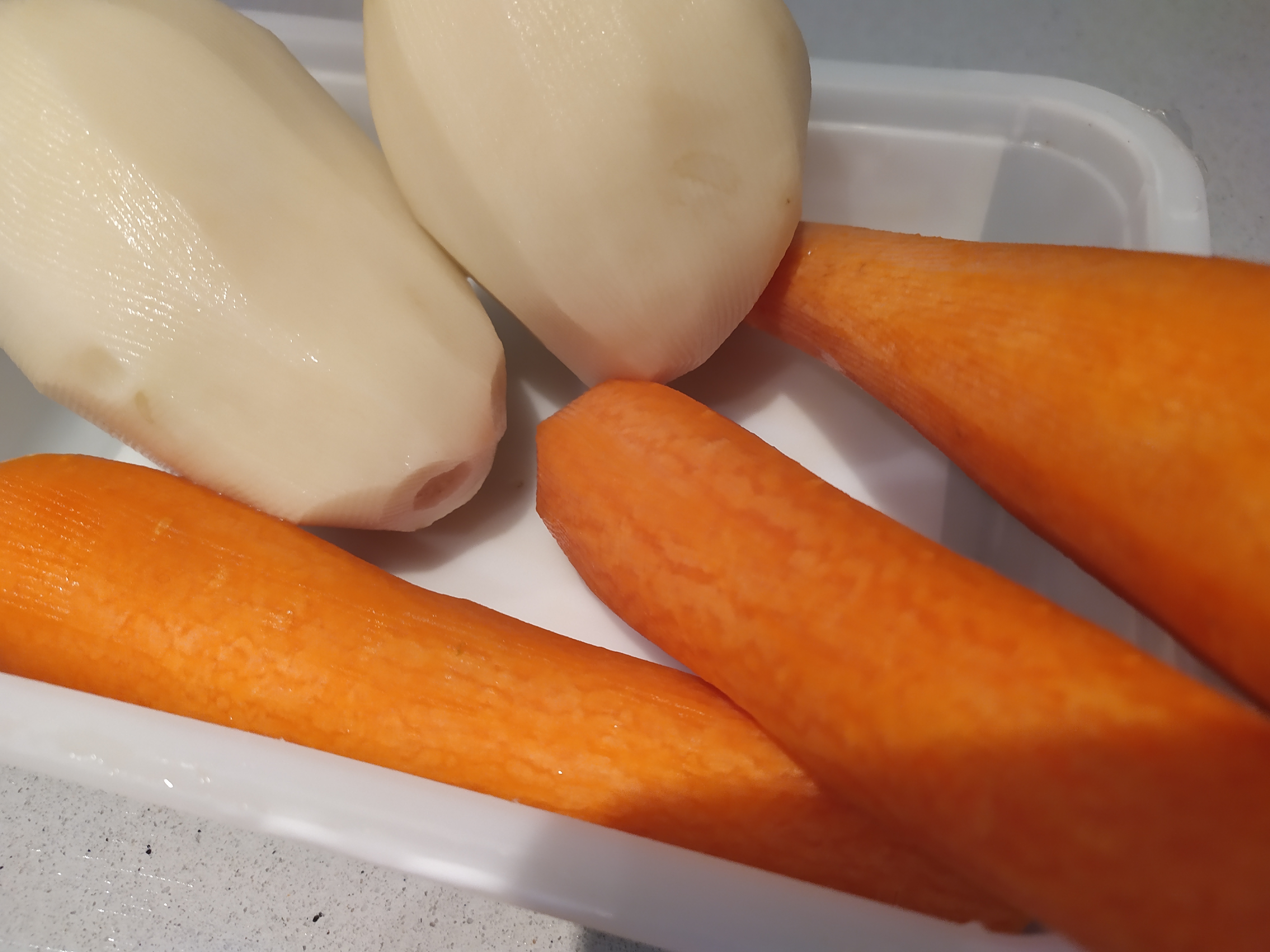 -empezamos pelando las zanahorias y las patatas y a continuación las rallamos (he dejado unos trozos de patata sin rallar y los he cortado finitos para luego decorar por encima)