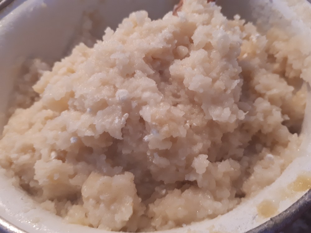 -cuando el agua empiece a hervir, con el fuego encendido, añadimos la harina y removemos hasta que esté cocinada. Removemos bien y rápido para que no se pegue en el cazo