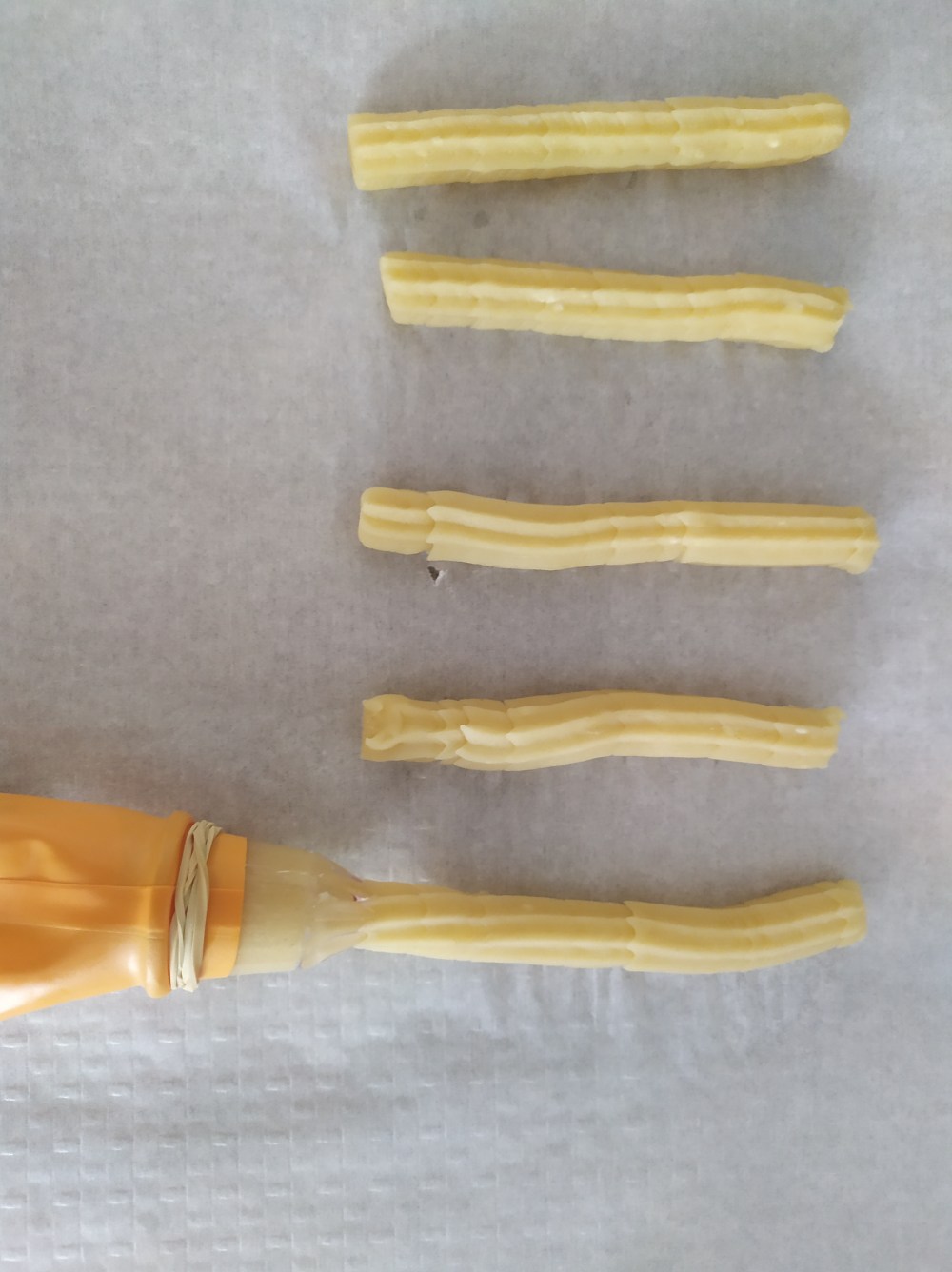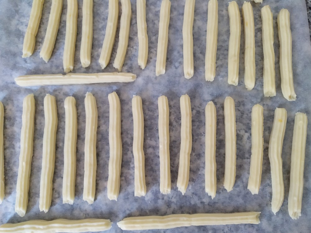 -con la masa templada dentro de la manga, la apretamos y le damos la forma deseada sobre un papel de horno antes de freirlos. También podemos congelar algunos si no los queremos hacer todos a la vez
