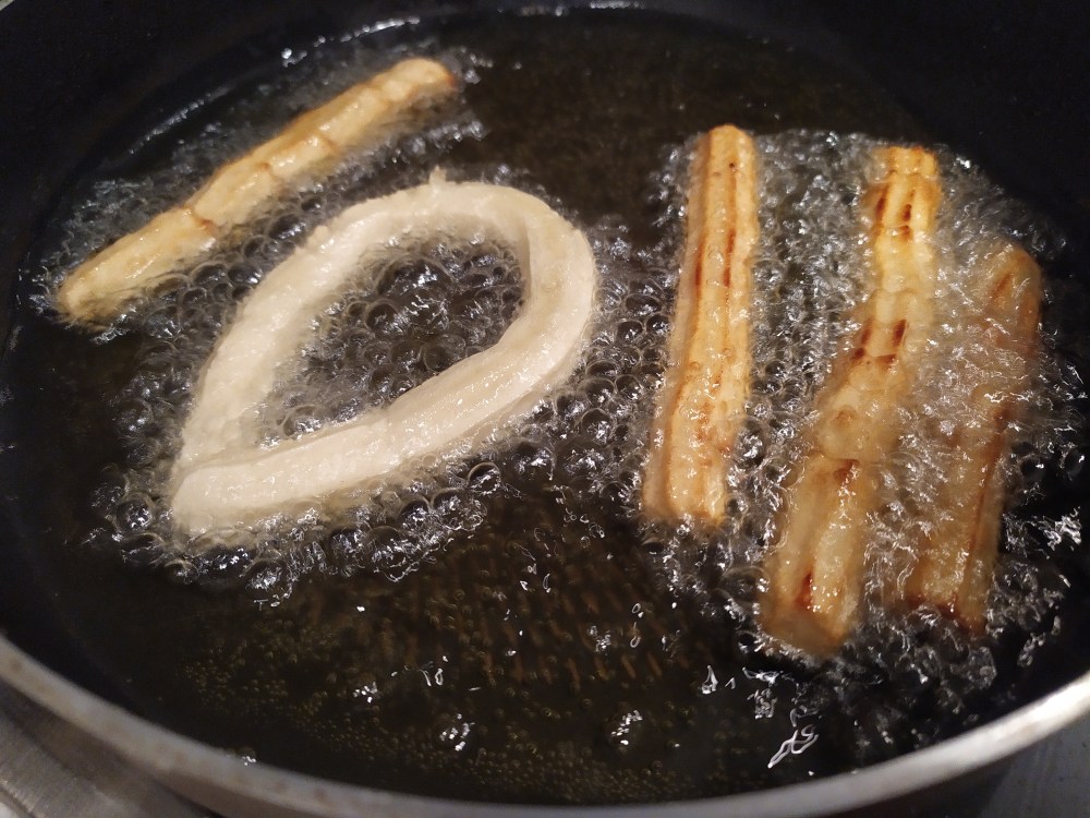 -colocamos la masa en la churrera y le damos la forma deseada con la boquilla adecuada (hay para churros y porras)