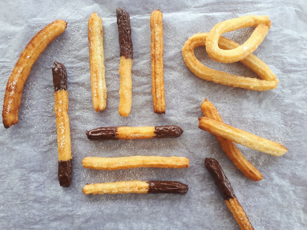 Reconozco que esta receta es un tanto peculiar, ya que no es saludable ni tan laboriosa como otras. Pero tiene un sentido y la he querido publicar después de hacerlos y compartirlos con la familia. A mi abuela le encantan los churros y estos días le apetecen, así que no lo he dudado y me he puesto manos a la obra. El otro día dejé la masa preparada por la mañana y al día siguiente los freí para llevárselos para desayunar. Mis padres, Rafa y mi tía también fueron conejillos de indias de este experimento. A algunos les añadí azúcar por encima, otros los bañé en chocolate y otros los dejé sin nada. No he tardado en repetirlos para el resto de la familia, que también querían probarlos. En una semana los he hecho tres veces, merojando la receta cada vez. Espero que si los preparáis, tengan tanto éxito como estos. Os dejo dos versiones, en función de si los preparáis con una manga pastelera (la masa tiene que quedar más blandita) o una churrera (la masa es más consistente). Desde que una compañera de trabajo me regaló su churrera, este verano nos hemos puesto las botas preparando churros para desayunar los fines de semana y he vuelto a repetir con la familia. Con la manga pastelera tenéis que ir con cuidado de que no se rompa, ya que la masa es densa.