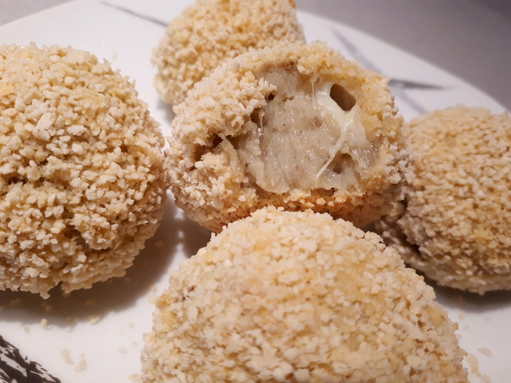 -cuando la masa esté fría y la podamos trabajar, le damos forma y vamos haciendo bolitas. Luego, las pasamos por huevo batido, pan rallado y repetimos este paso para que no rebienten en el horno (el segundo rebozado yo lo he hecho con pan rallado crujiente)