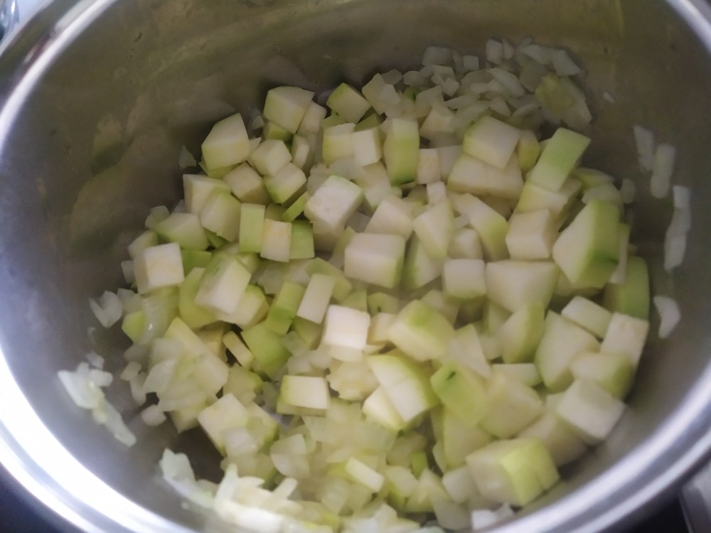 -por otro lado, ponemos aceite en un cazo al fuego y le añadimos la media cebolla pelada y picada, movemos hasta que se dore. Añadimos al cazo los calabacines pelados y cortados a daditos y dejamos cocinar durante unos 15 minutos. Cuando esté templado, trituramos en el mismo bol donde tenemos las berenjenas trituradas