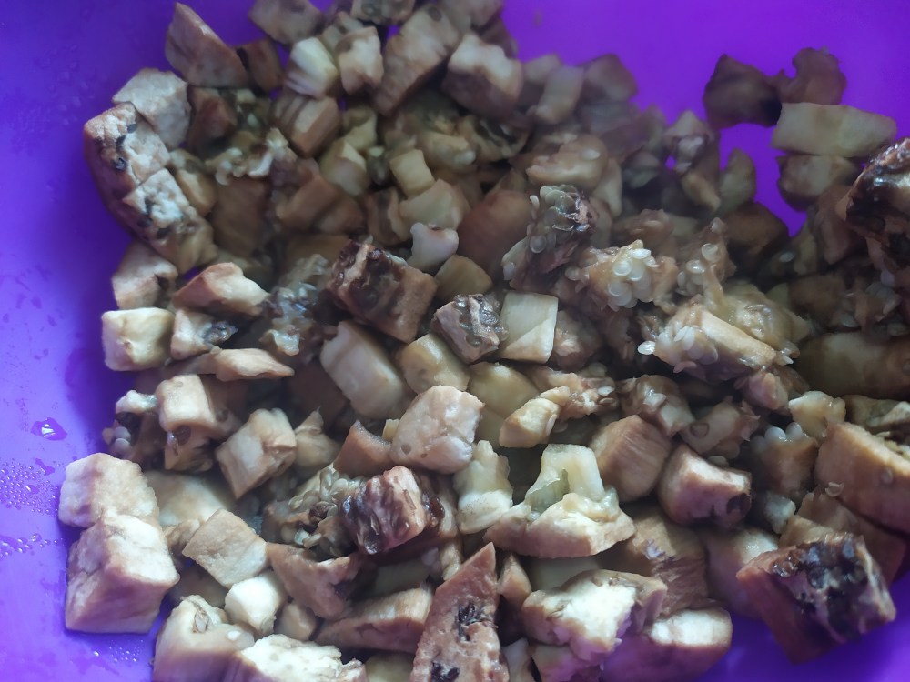 -por un lado, pelamos las berenjenas y las cortamos a daditos. Las llevamos al microondas un rato para que se ablanden. Las escurrimos para quitarles el agua que han soltado y cuando estén templadas, las trituramos. Reservamos
