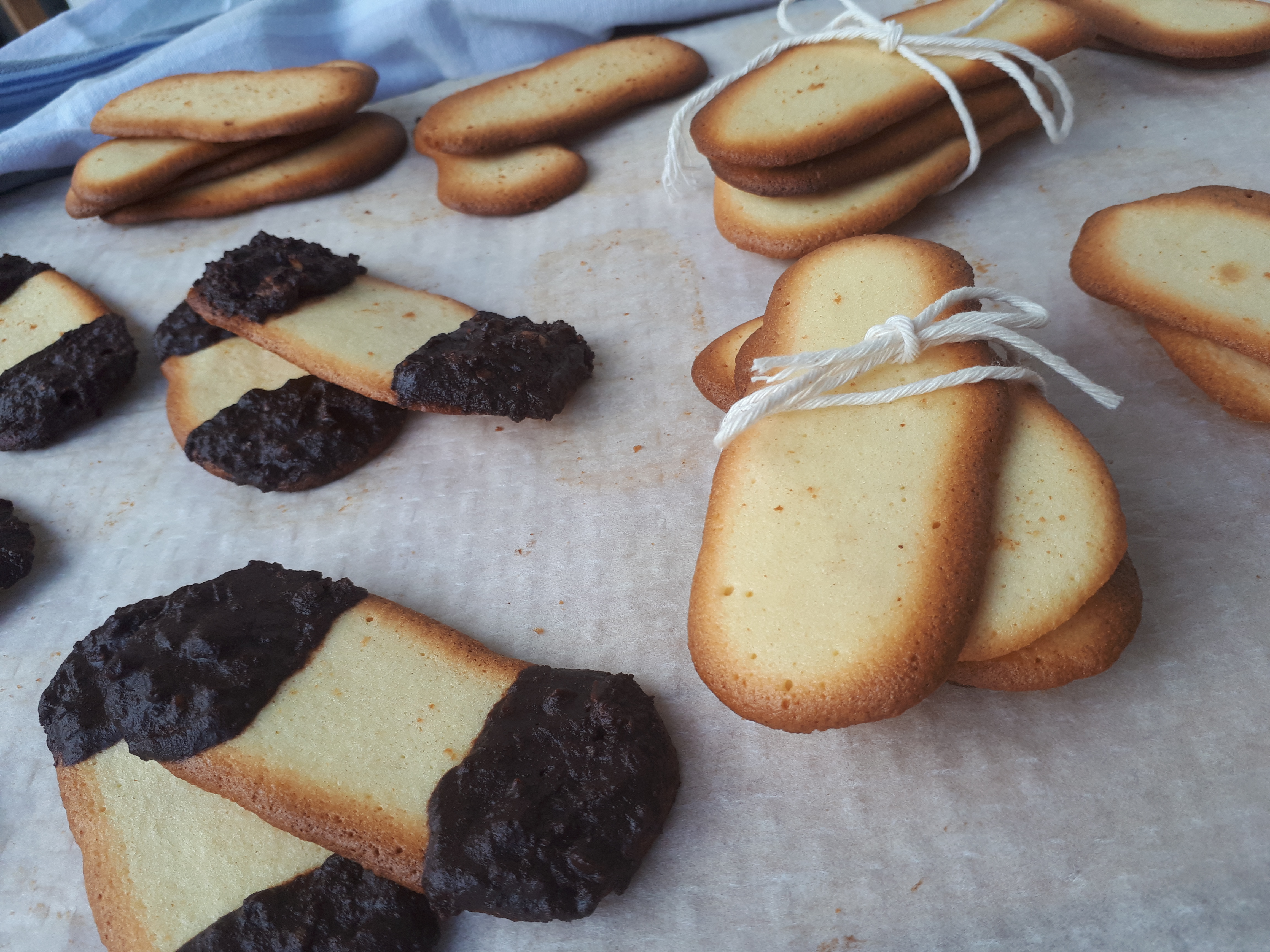 Ya llevaba tiempo con esta receta pendiente. Cuando vamos a almorzar con mi suegro, en el restaurante al que solemos ir tienen en la entrada unas bolsitas con pastas artesanas que hacen ellos mismos y casi siempre compro algo (normalmente lenguas de gato). Un día le pregunté a la cocinera cómo las prepara ella, ya que me encantan cómo le quedan. Espero que si hacéis esta receta os guste el resultado tanto como a nosotros. Nos las acabamos en dos días… A la hora de hacerlas me sorprendió que al sacarlas del horno estaban blanditas (una textura parecida a las vainillas). Ya me pensaba que había hecho algo mal y me tocaría mejorar la receta, pero cuando se enfriaron se endurecieron y quedaron perfectas. Para darles la forma, he utilizado la manga pastelera sin boquilla, pero si no tenéis, podéis hacerlo con una bolsita y le cortáis una punta. He optado por añadir un toque de chocolate a esta receta y he aprovechado una mezcla que tenía preparada de chocolate con avellanas picadas y he decorado las puntas de las lenguas de gato. Para la próxima repetiré, pero lo haré solo con chocolate de cobertura.