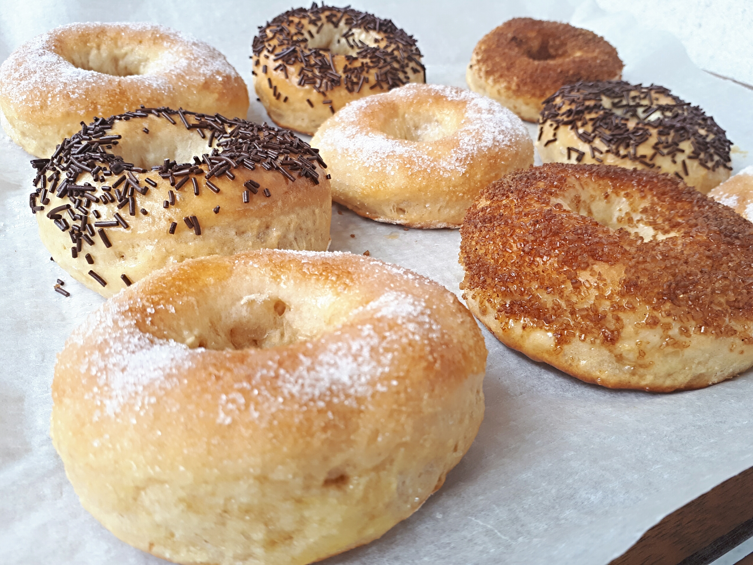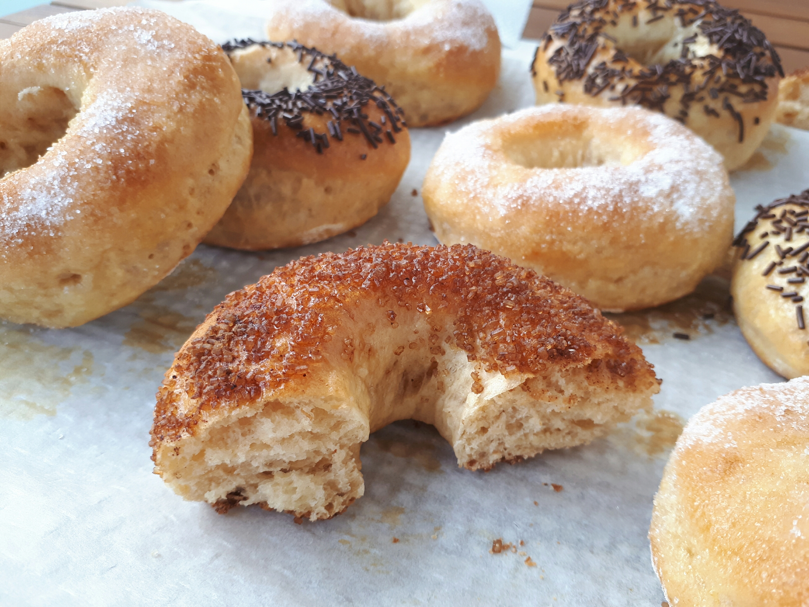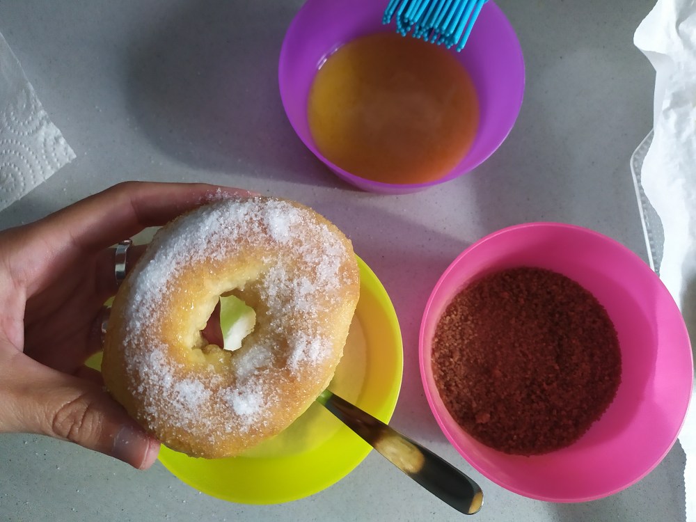 Cuando era pequeña, algunos días para desayunar o merendar tocaba pastas y una de ellas eran los donuts, que me encantaban. De chocolate negro, con azúcar, de dos chocolates, rellenos de crema de cacao… La verdad es que me quedo con cualquiera de ellos. Es uno de esos dulces que nunca pasa de moda y entran muy bien. Yo los pido de vez en cuando para desayunar en alguna panadería que los hacen ellos y están esponjosos, gorditos y con mucha azúcar por fuera. He visto varias recetas en Internet para hacerlos en casa y hemos hecho para toda la familia, ya que con las cantidades que indico salen unas 24 unidades. Los hemos decorado por fuera con varios toppings: azúcar blanca, mezcla de azúcar y canela y birutas de chocolate, para que cada uno escoja su preferido.