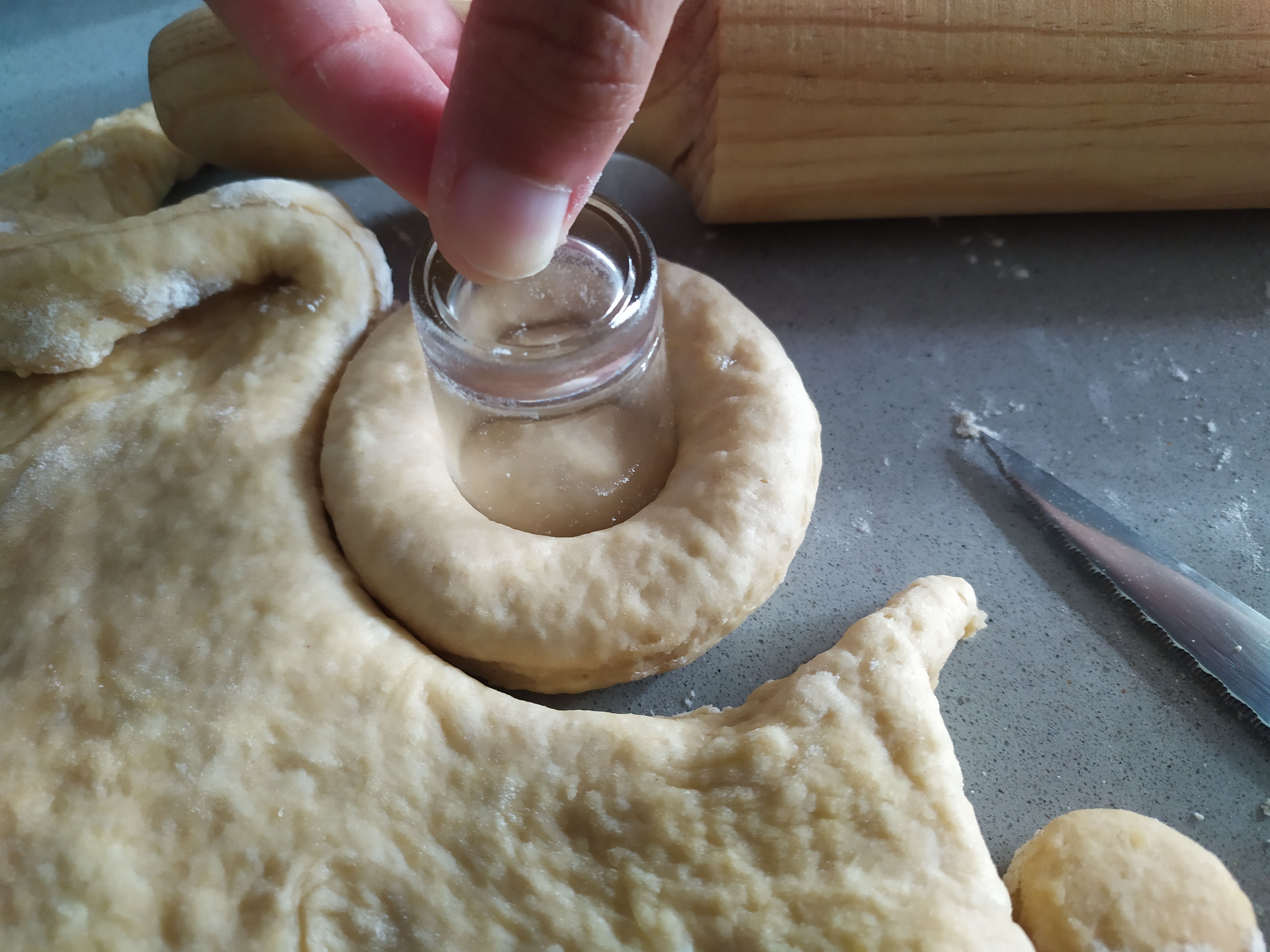 -estiramos la masa encima del mármol enharinado con la ayuda de un rodillo y la dejamos de un centímetro de grosor. Con la ayuda de un cortador o con vasos de diferente diámetro los vamos cortando y los colocamos encima de un papel de horno