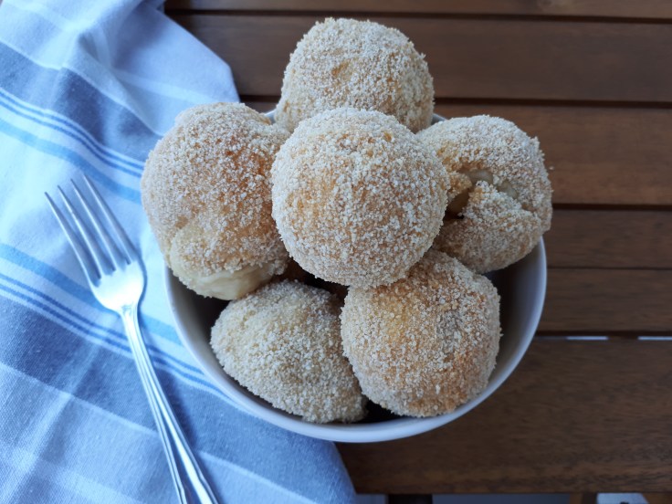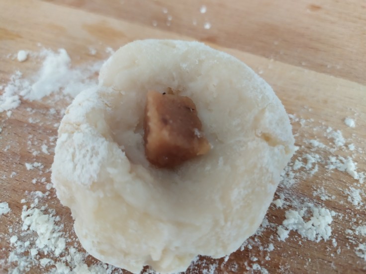 -una vez reposada la masa, con las manos enharinadas, hacemos bolitas y en medio colocamos un trocito pequeño de membrillo