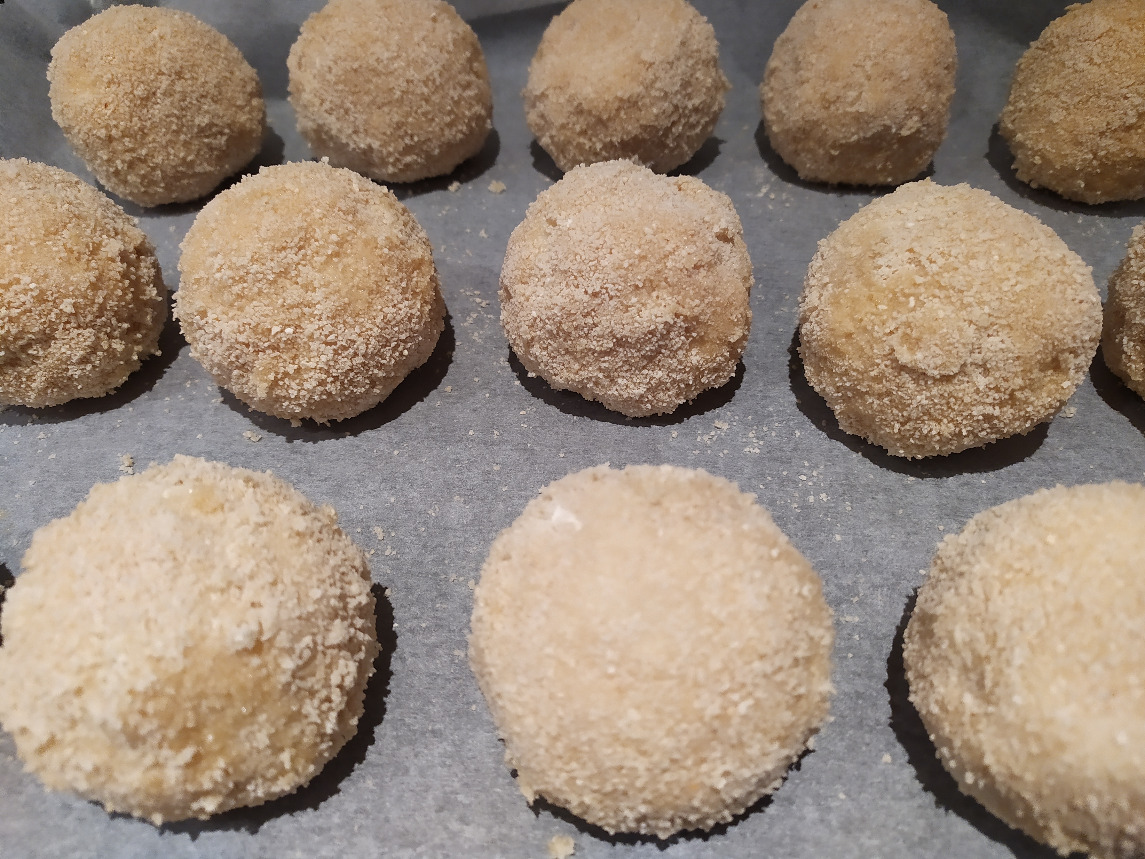 -ahora toca sellarlas y rebozarlas antes de hornearlas. Para que no se abran cuandos se hornean podemos hacer un doble rebozado. Empezamos sellando las croquetas con un poco de harina. Si tenemos tiempo, os recomiendo congelar las bolas un rato antes de rebozarlas. Después, las pasamos por una bandejita con huevo batido, a continuación por otra con pan rallado y las rebozamos bien. Cuando las tengamos todas rebozadas, repetimos este paso: las volvemos a pasar por huevo y después por pan rallado