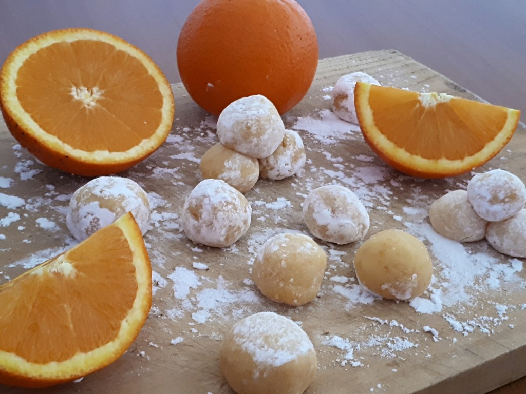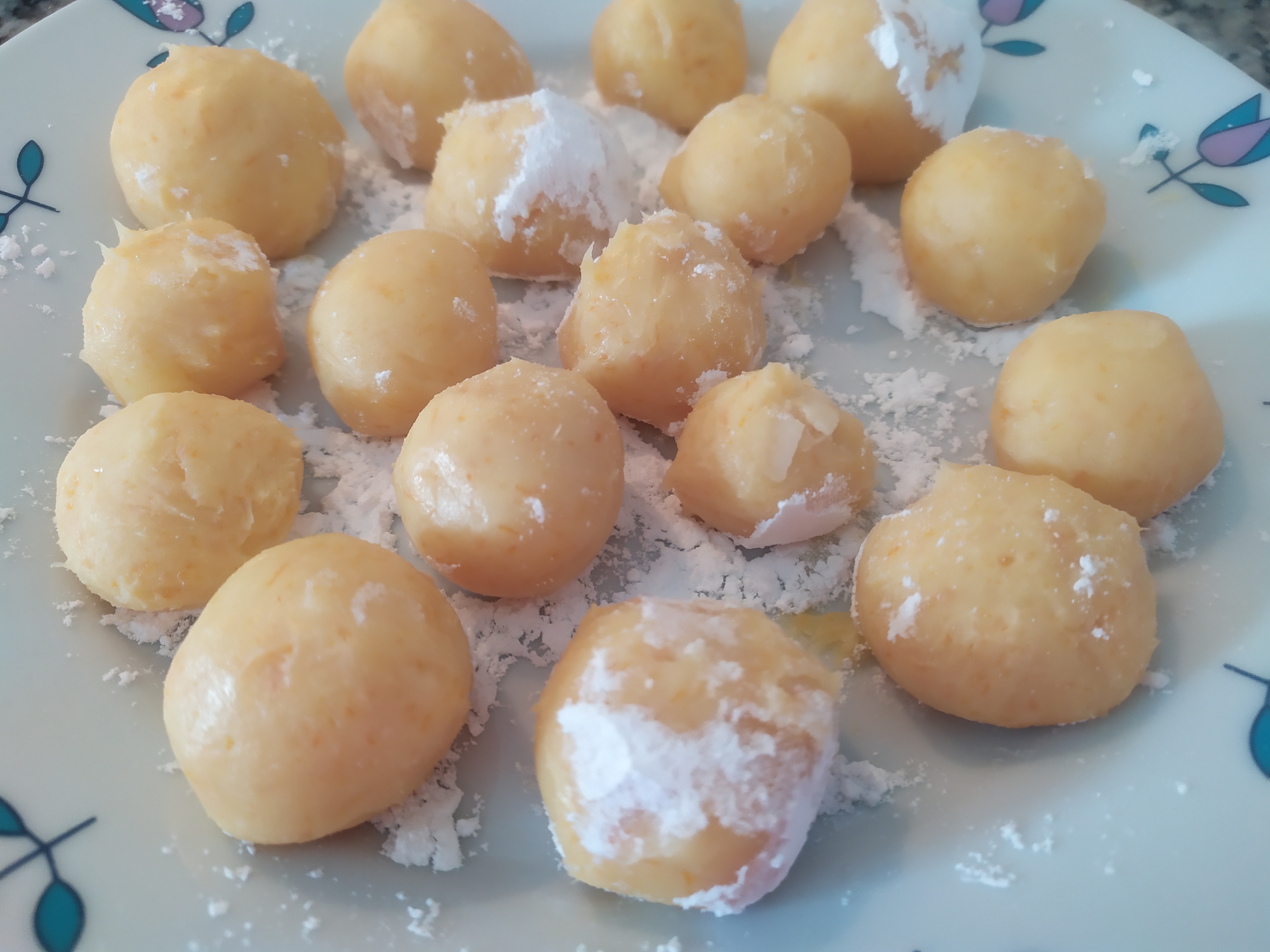 -cuando la masa esté bien fría y tenga consistencia para poder trabajarla, con la ayuda de una cucharilla hacemos bolitas y las colocamos en un plato sobre una capa de azúcar glas, para que no se peguen