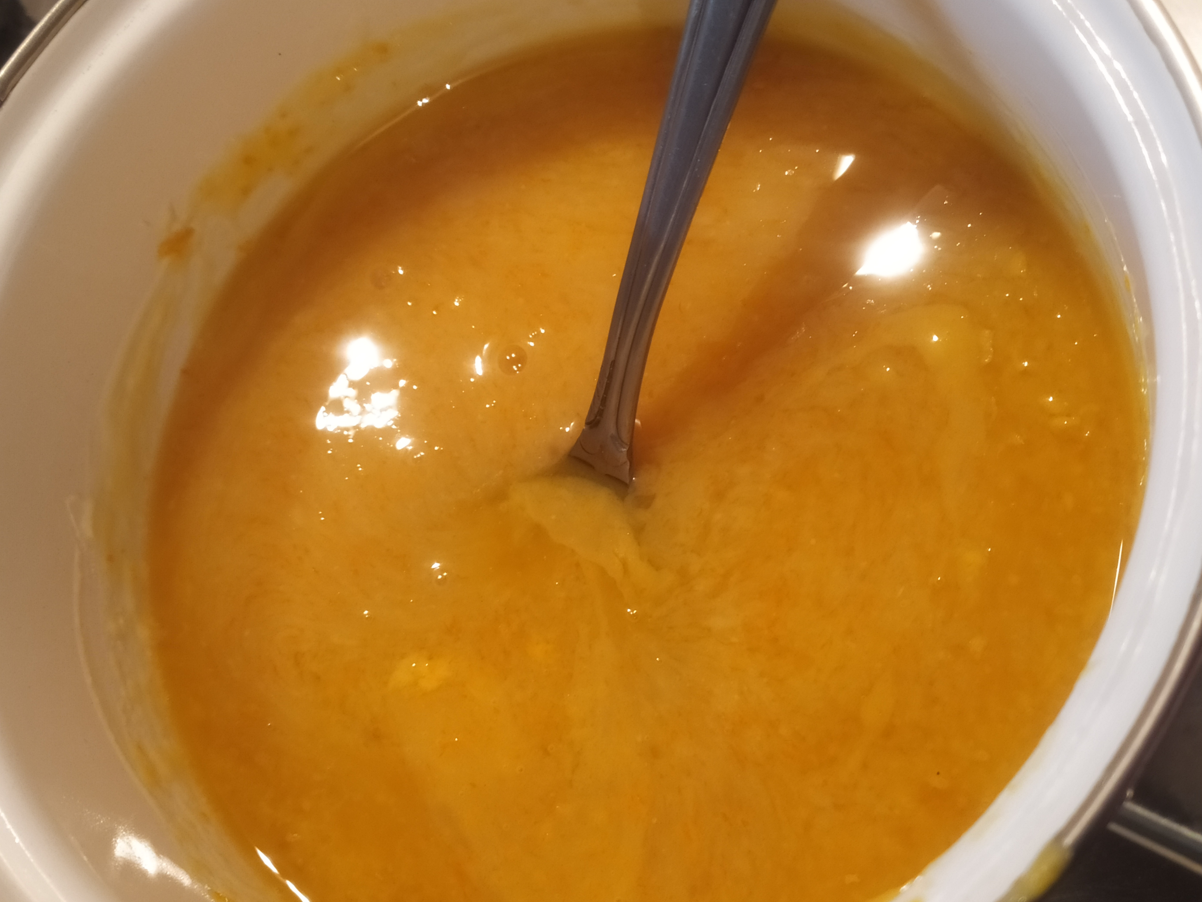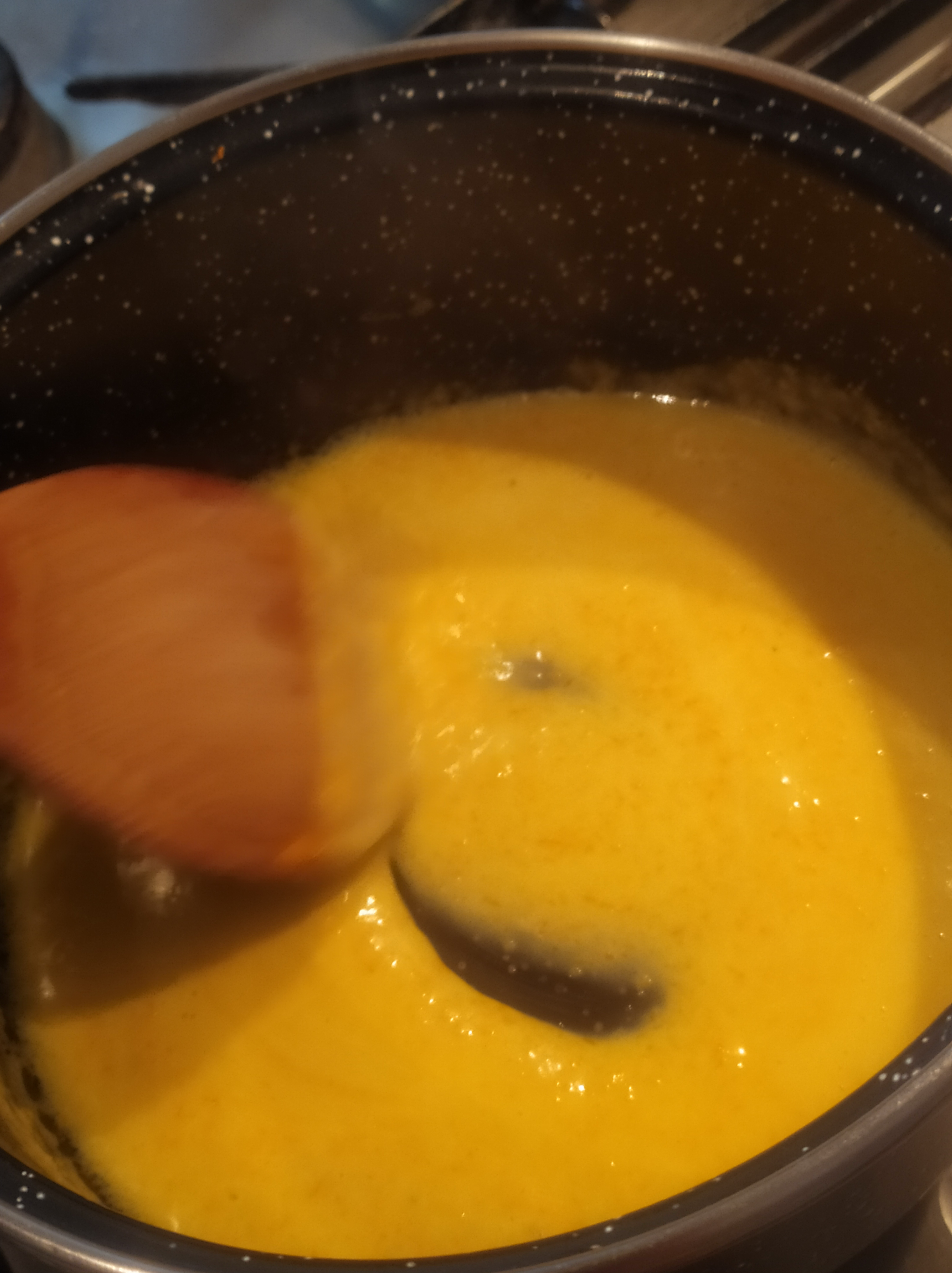 -ponemos la ralladura en un cazo junto con la mantequilla y mezclamos con el fuego lento para que no se queme. Añadimos también las 4 cucharadas de nata y seguimos removiendo bien (un par de minutos aproximdamente)