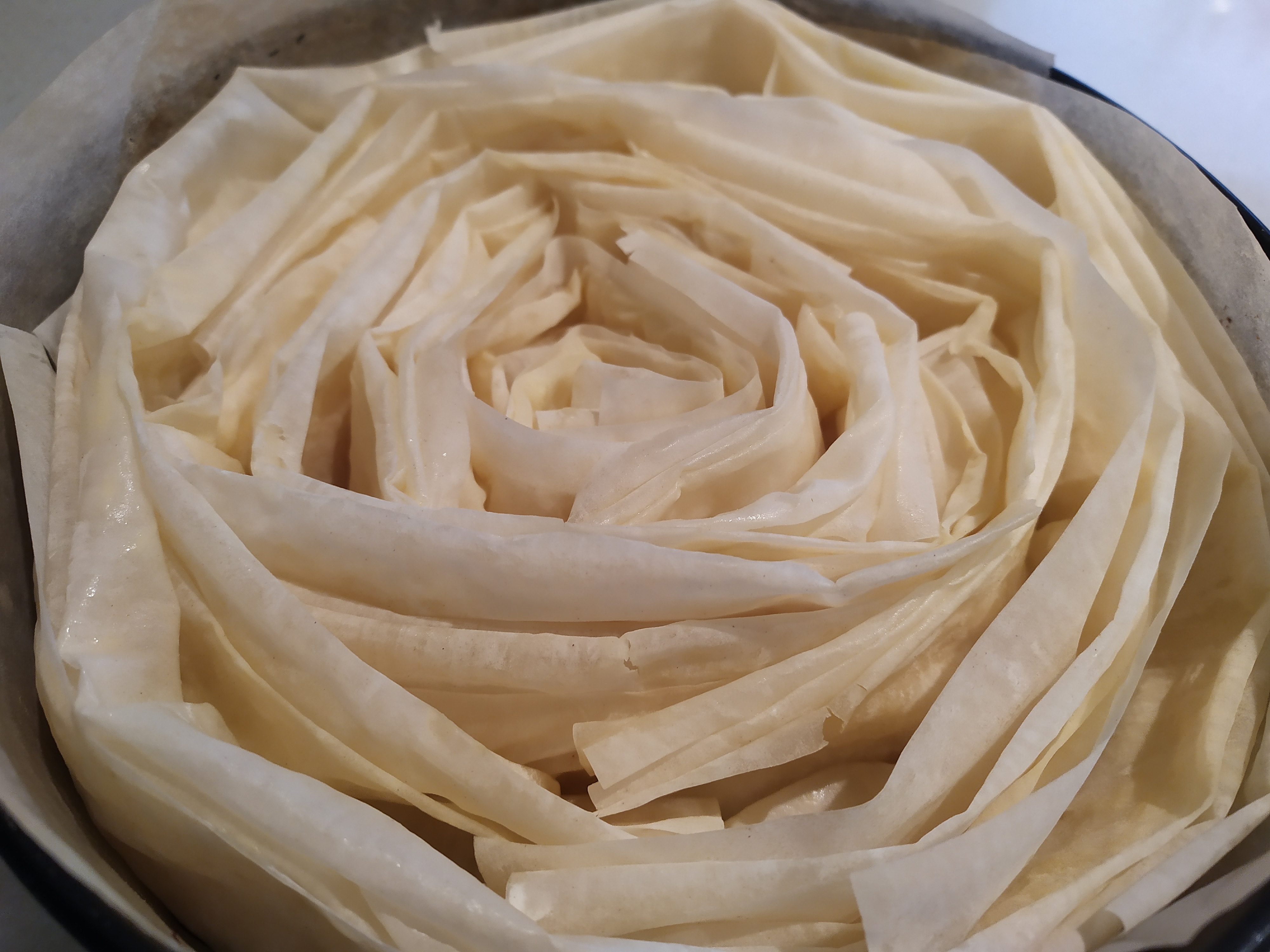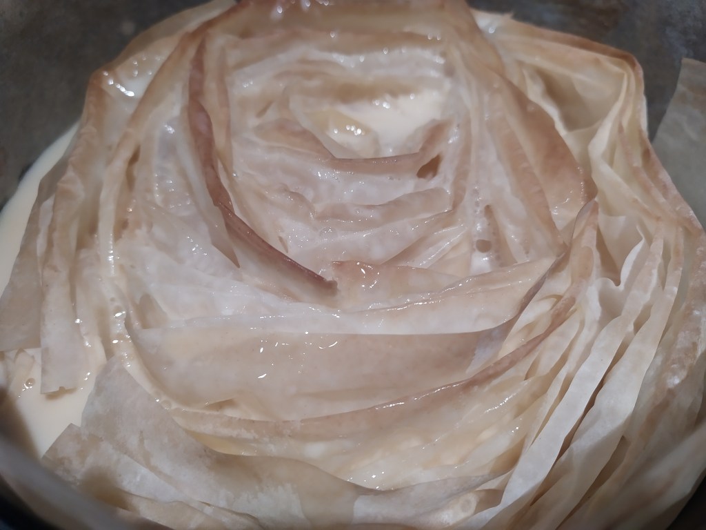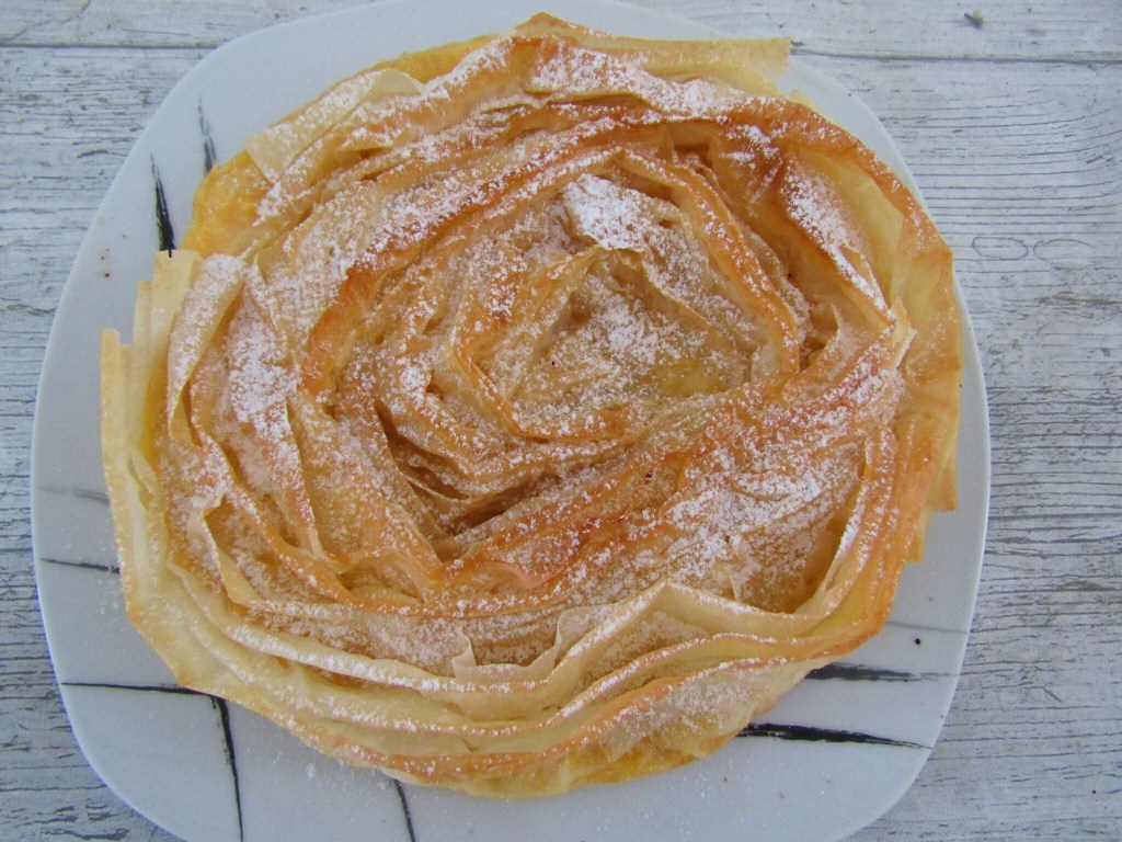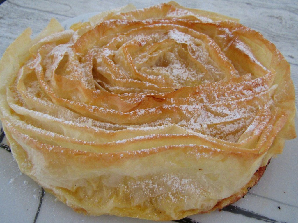 Para celebrar el cumpleaños de mi madre, este año he optado por hacer un postre diferente. Buscando nuevas recetas por Internet, me llamó la atención este dulce conocido como Ruffled milk pie, tarta flor o tarta rizada de crema. Está elaborada con masa filo y con un relleno cremoso, preparado con leche, huevos y azúcar, con un toque de canela y piel de limón. Cometí un error que comparto con vosotros para que no os pase lo mismo si optáis por prepararlo en casa: no utilicéis un molde desmoldable, ya que se escapa parte de líquido por la junta de unión. Como compré dos paquetes de masa filo, el próximo lo haré con chocolate.