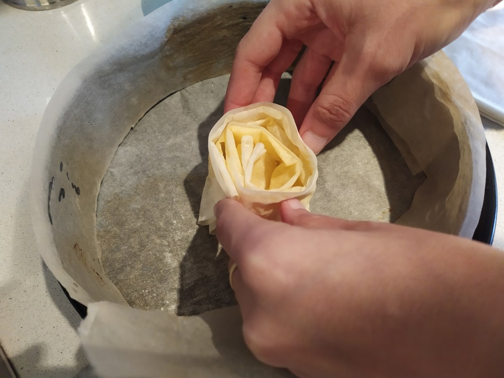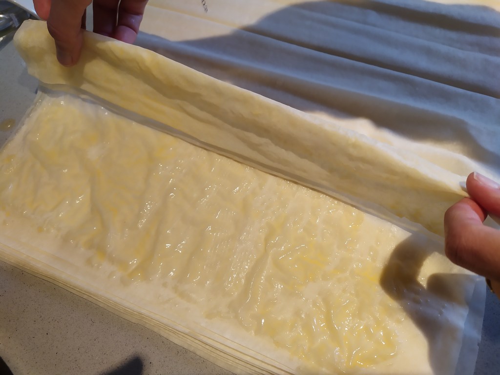 -derretimos la margarina en el microondas y vamos pintando cada una de las láminas de masa filo, que doblamos como si fueran un abanico, con pequeños dobleces en un sentido y el siguiente en el contrario, teniendo en cuenta la altura que queremos