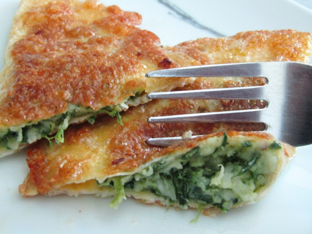 Sugerencia: como seguramente os sobrará un poco de relleno y tenemos medio huevo batido que no hemos utilizado, os propongo prearar una tapita de tortilla rellena, que queda espectacular. Vertemos el huevo en la sartén que hemos utilizado para dorar los piñones con un poco de aceite, incorporamos el relleno y cerramos como si fuera una crepe
