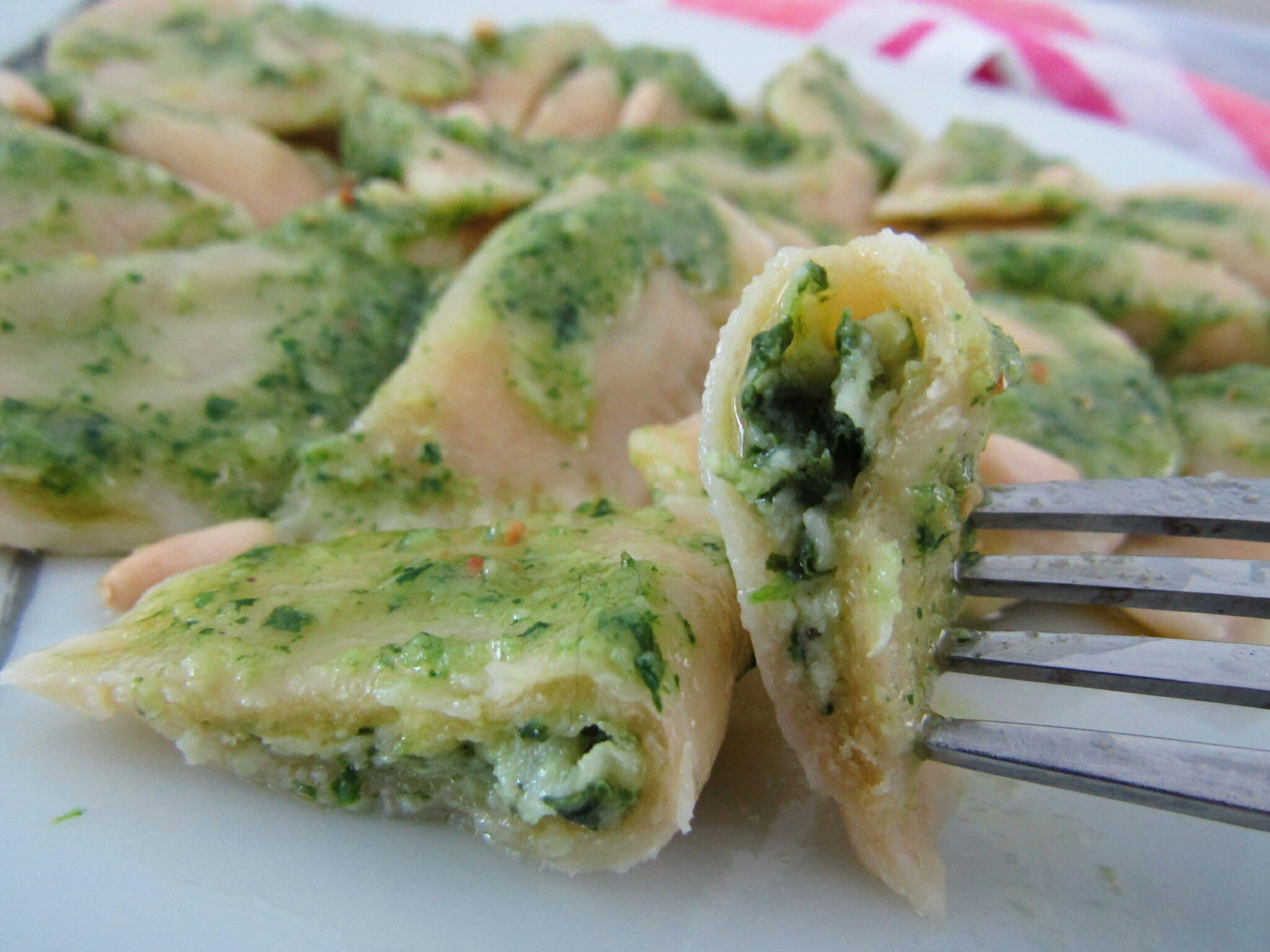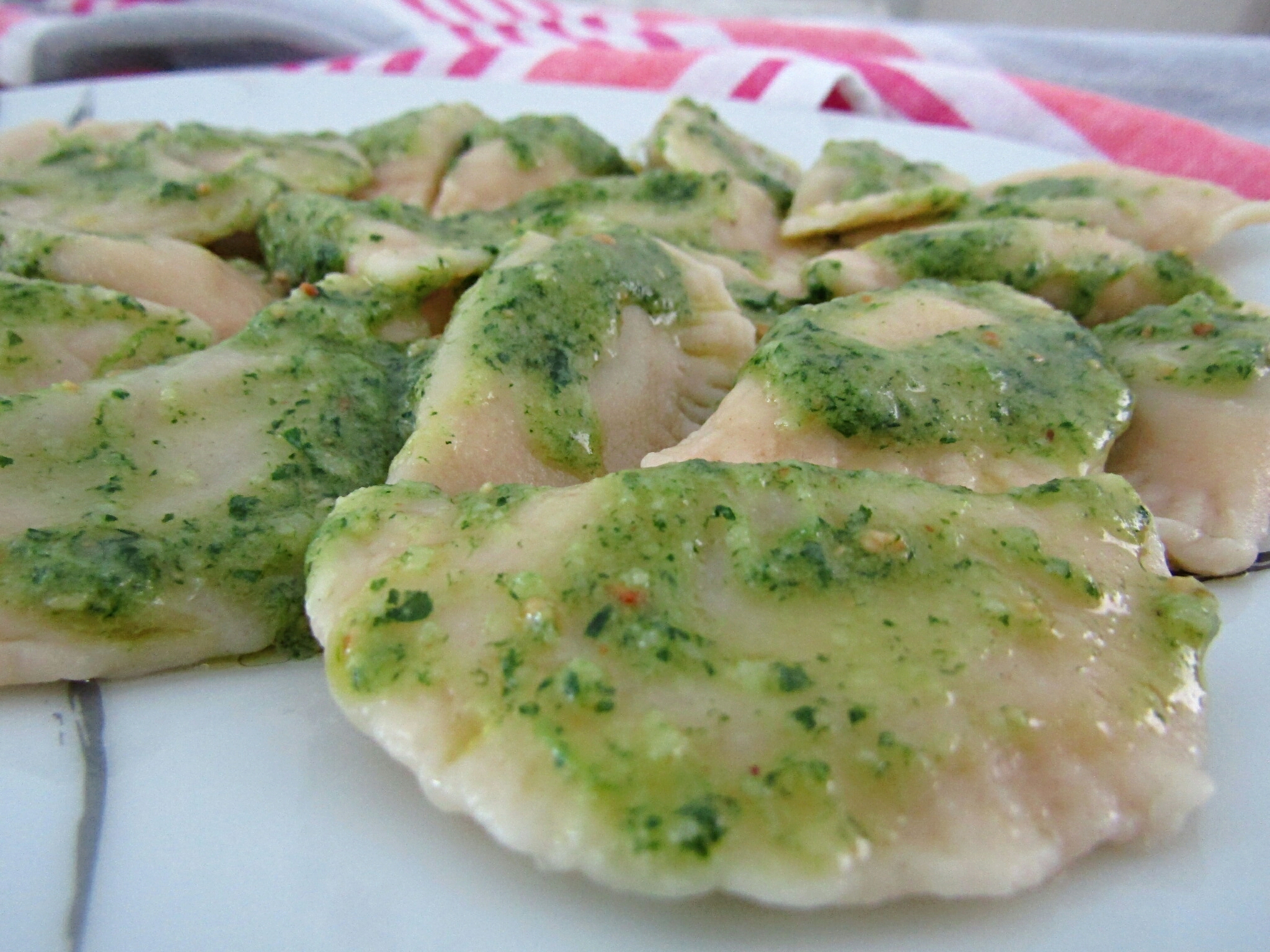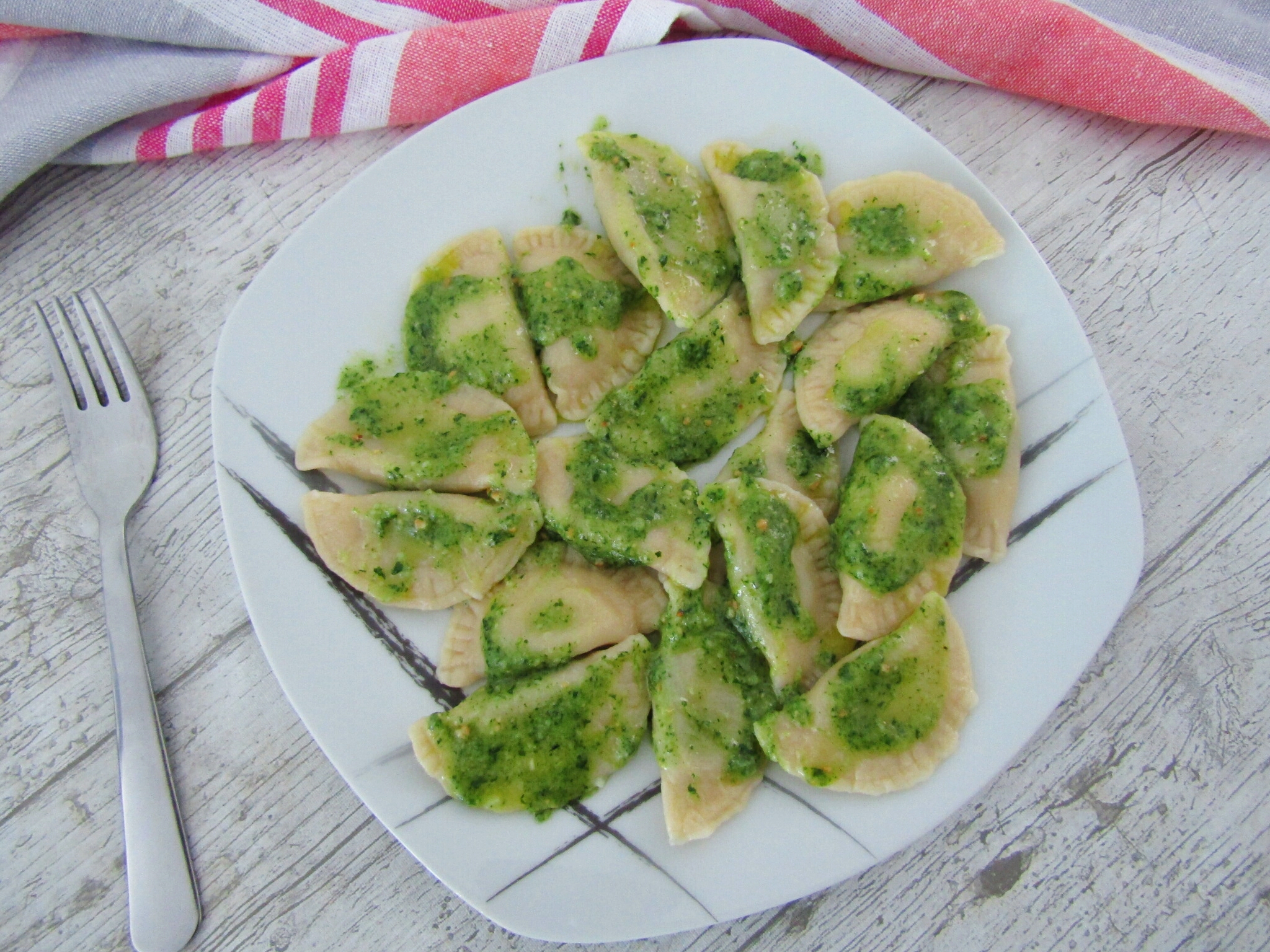 El encierro por el coronavirus nos está haciendo cocinar más de lo normal y especialmente los fines de semana. En esta ocasión, como no teníamos muchos más planes para el sábado, nos hemos pasado unas horas en la cocina preparando pasta rellena. Hemos hecho la masa (buenísima), un relleno de queso y espinacas y una salsa con estos mismos ingredientes, ya que no teníamos albahaca para hacer pesto, pero el resultado nos ha encantado. El experimento ha salido genial, nos la hemos comido recién hecha y nos ha sentado de maravilla. Además, a la hora de cocer la pasta no se nos ha abierto, estamos muy contentos con esta primera experiencia preparando pasta. Otra opción es hacer espaguetis; se estira bien la masa con la ayuda de un rodillo y luego se cortan tiritas finitas. A nosotros nos ha sobrado un poco del relleno y como se utiliza solo medio huevo batido, hemos hecho una tapita de tortilla rellena, que nos ha encantado (os dejo también al final de la receta esta sugerencia para no desaprovechar nada). Con las cantidades de esta receta salen 40 unidades y como referencia es 1 huevo y una cucharada de aceite por cada 100 gramos de harina (1 ración generosa). Nosotros no tenemos máquina para estirar la pasta, lo hemos hecho con un rodillo y para darle forma, mi prima Laia y su pareja Sergio, que son vecinos nuestros pared con pared, nos han dejado un aparato que tienen para hacer empanadillas y nos ha ido genial.