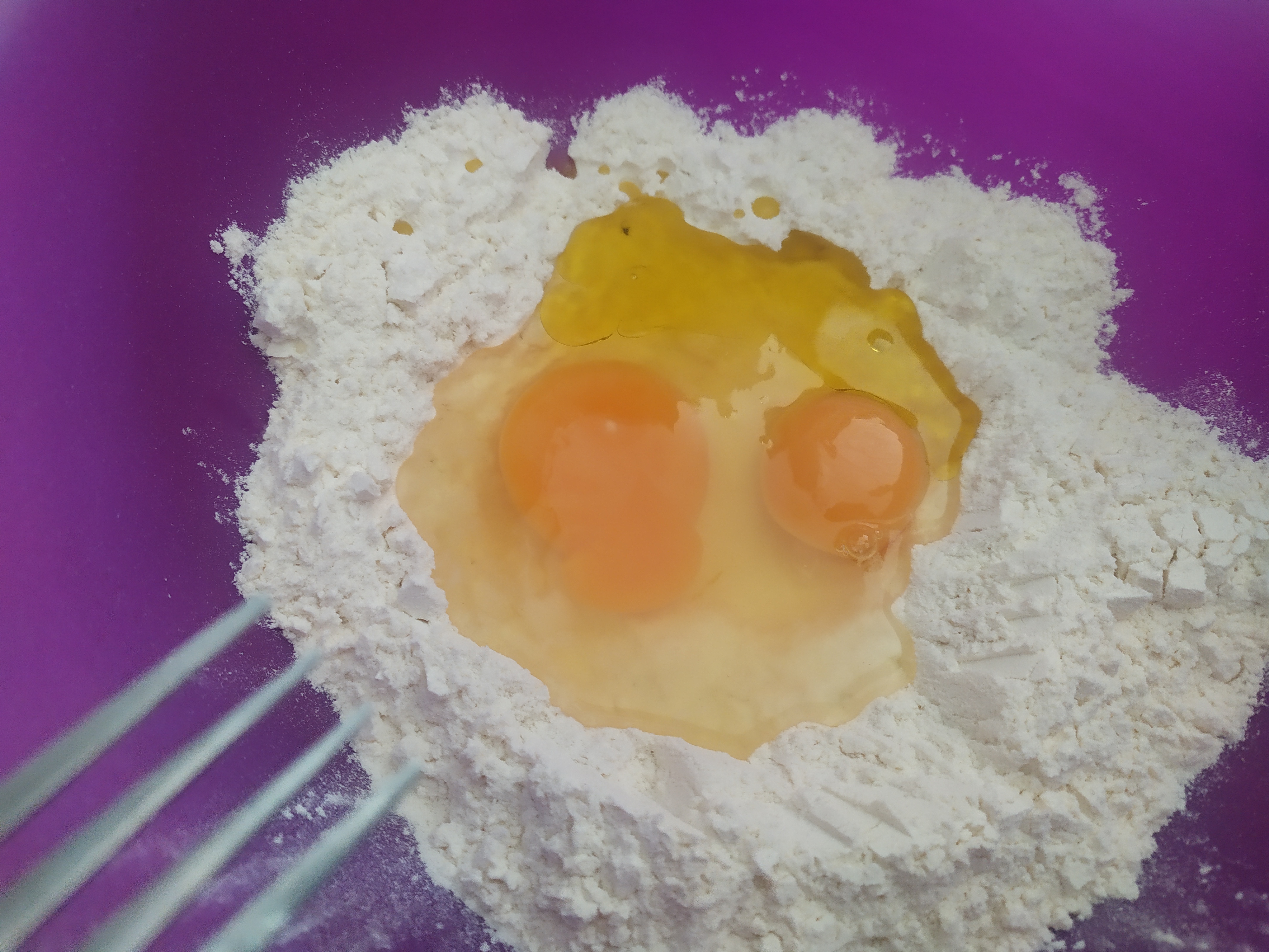 -colocamos en un bol la harina y enterramos una cucharadita de sal. Hacemos un hueco en el medio y añadimos los dos huevos y las dos cucharadas de aceite