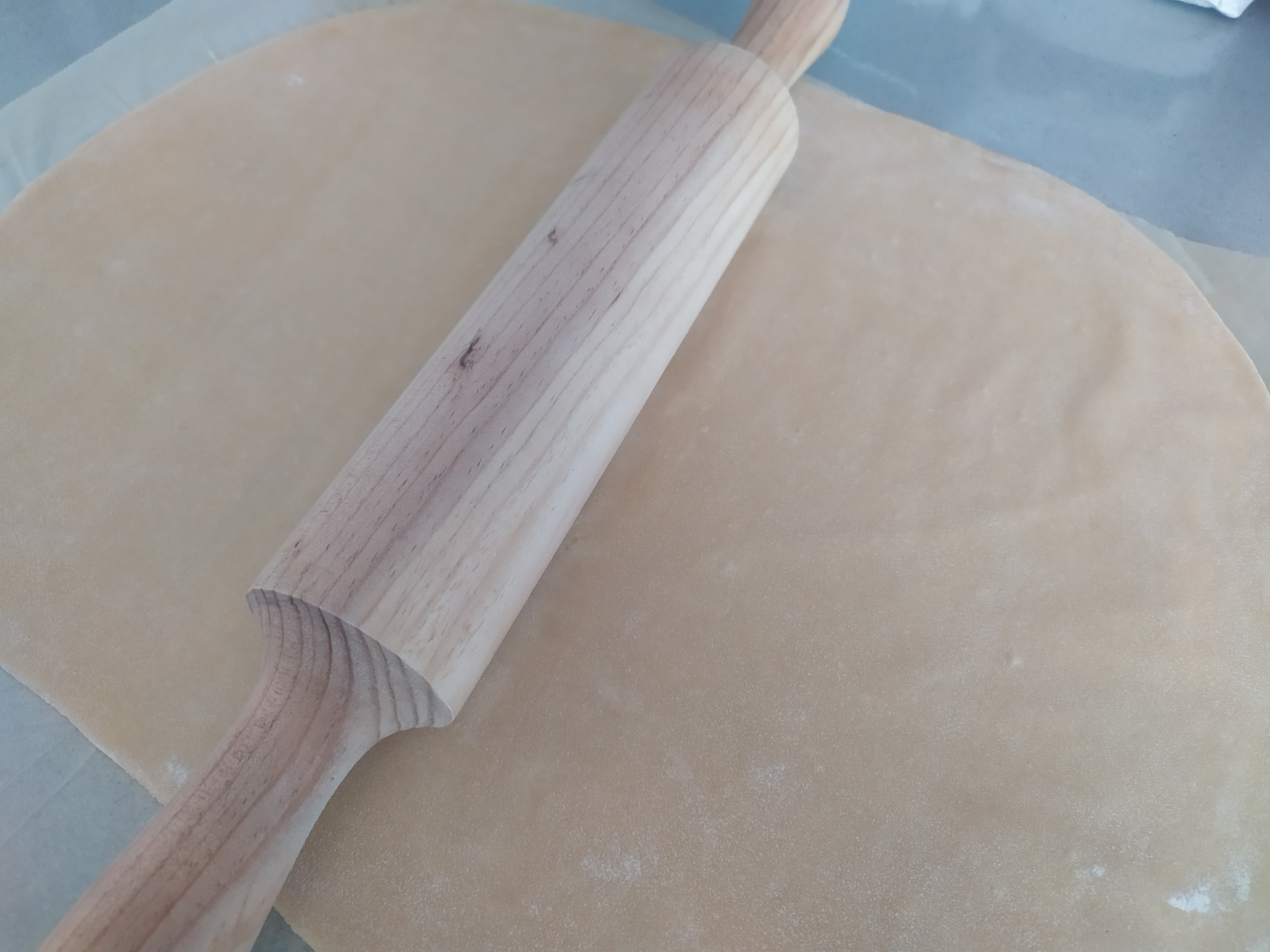 -ahora estiramos la masa encima de un papel de horno enharinado (dejarla bien finita) con la ayuda de un rodillo
