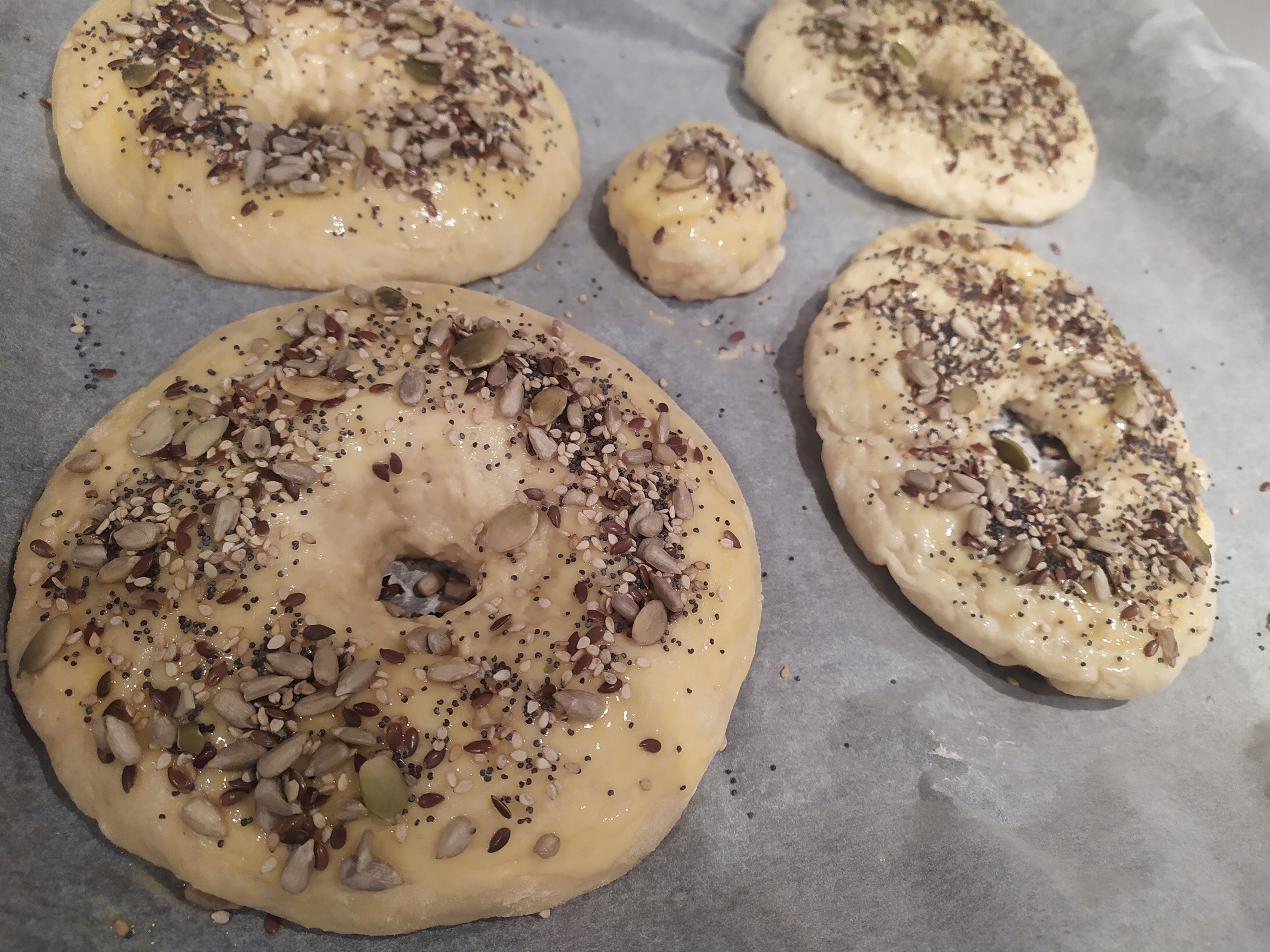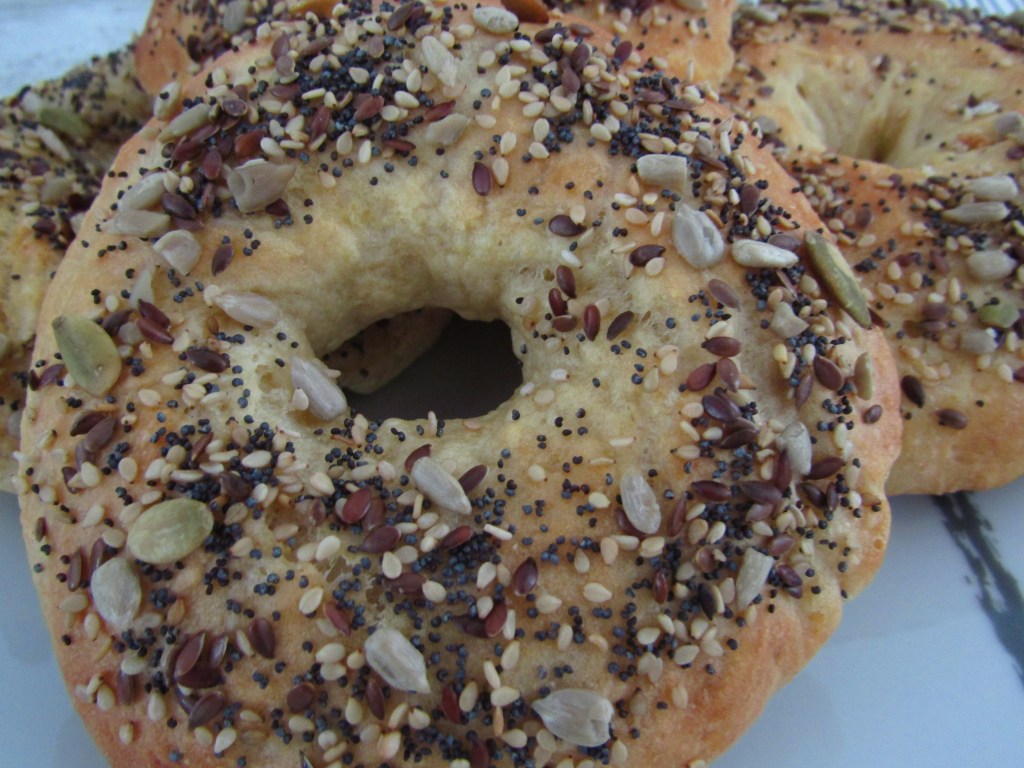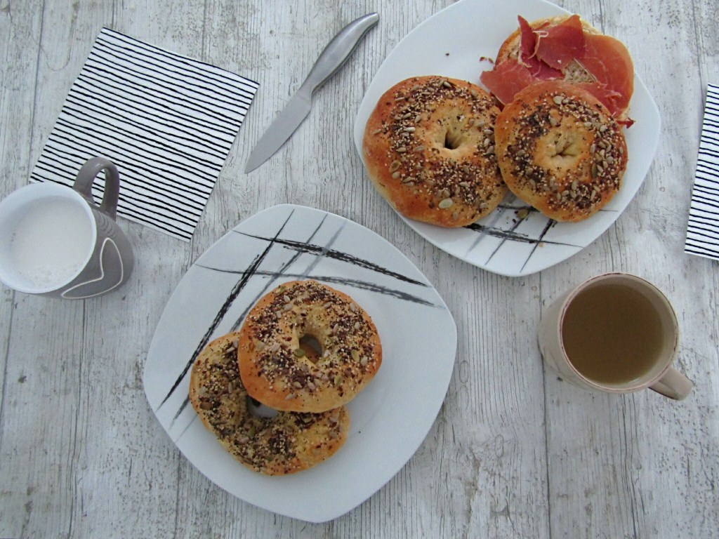 Dicen que a la tercera va la vencida; en mi experiencia con los bagels así ha sido. La primera vez que los hice no crecieron y no los pudimos abrir por la mitad para rellenarlos (aunque de sabor, muy buenos). La segunda vez que lo intentamos hicimos la mitad hervidos y la mitad no, para ver la diferencia. Y finalmente, a la tercera los hemos preparado teniendo en cuenta nuestras experiencias previas y ahora sí, nos han quedado genial. Si los hacéis siguiendo la receta, queda una masa esponjosa, que como dejamos reposar en varias ocasiones, crece y nos permite luego a la hora de comer, poderlos abrir por la mitad para rellenarlos. Además, tienen un sabor peculiar, ya que no son dulces ni tampoco muy sabrosos, pero con las semillas que le añadimos al final tras pintarlos con mantequilla le aporta un toque diferente. La base de la masa es similar a la del pan normal, ya que lleva los mismos ingredientes, pero se le incorpora un huevo y una cucharadita de miel. La harina es de fuerza, para que crezca más. Cuando empecé a leer recetas y buscar para prepararlos lo que más me llamó la atención fue que antes de hornearlos se tienen que pasar por una olla con agua hirviendo. Tras hacer la prueba de unos pasarlos por el agua y otros no, os aseguro que la diferencia se nota. Le aporta una textura peculiar, como una especie de corteza protectora y hace que la masa no sea como un bollito normal de pan. Es una alternativa saludable para hacer en casa otro tipo de pan, alternativo al bollito tradicional.
