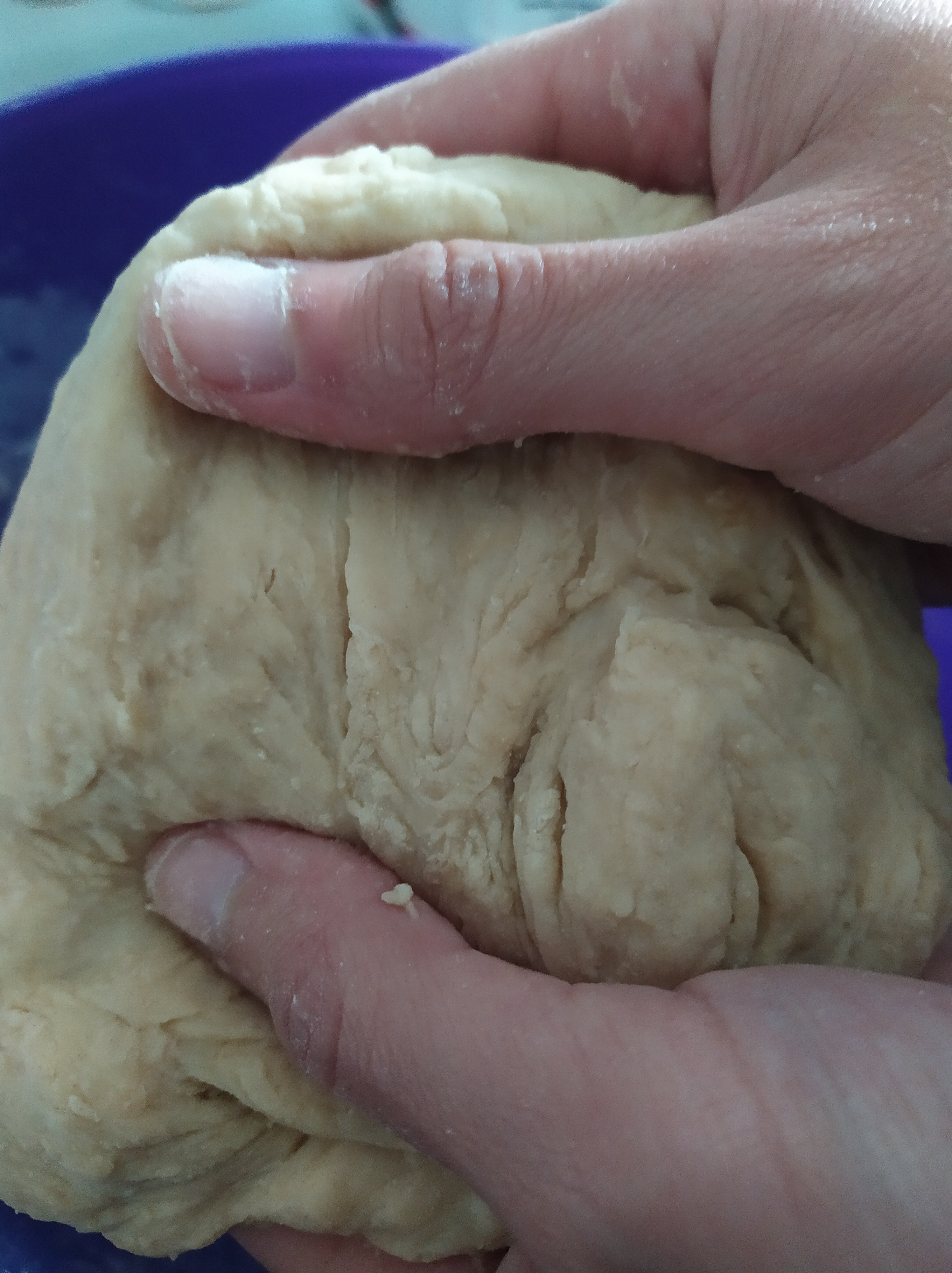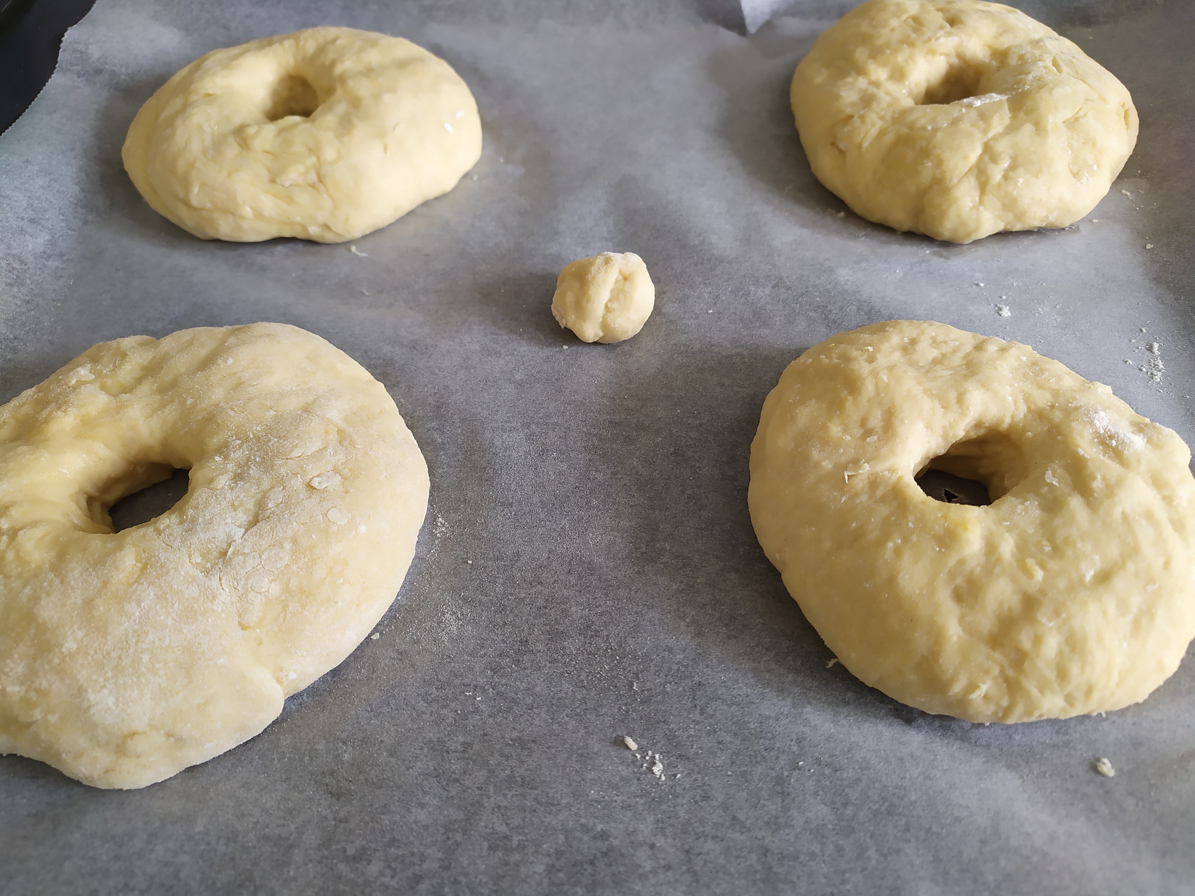 -cuando haya crecido, hacemos cuatro bolas y las chafamos con la mano (sin dejarlas tampoco muy chafadas) encima de un papel de horno bien enharinado (para que no se peguen)
