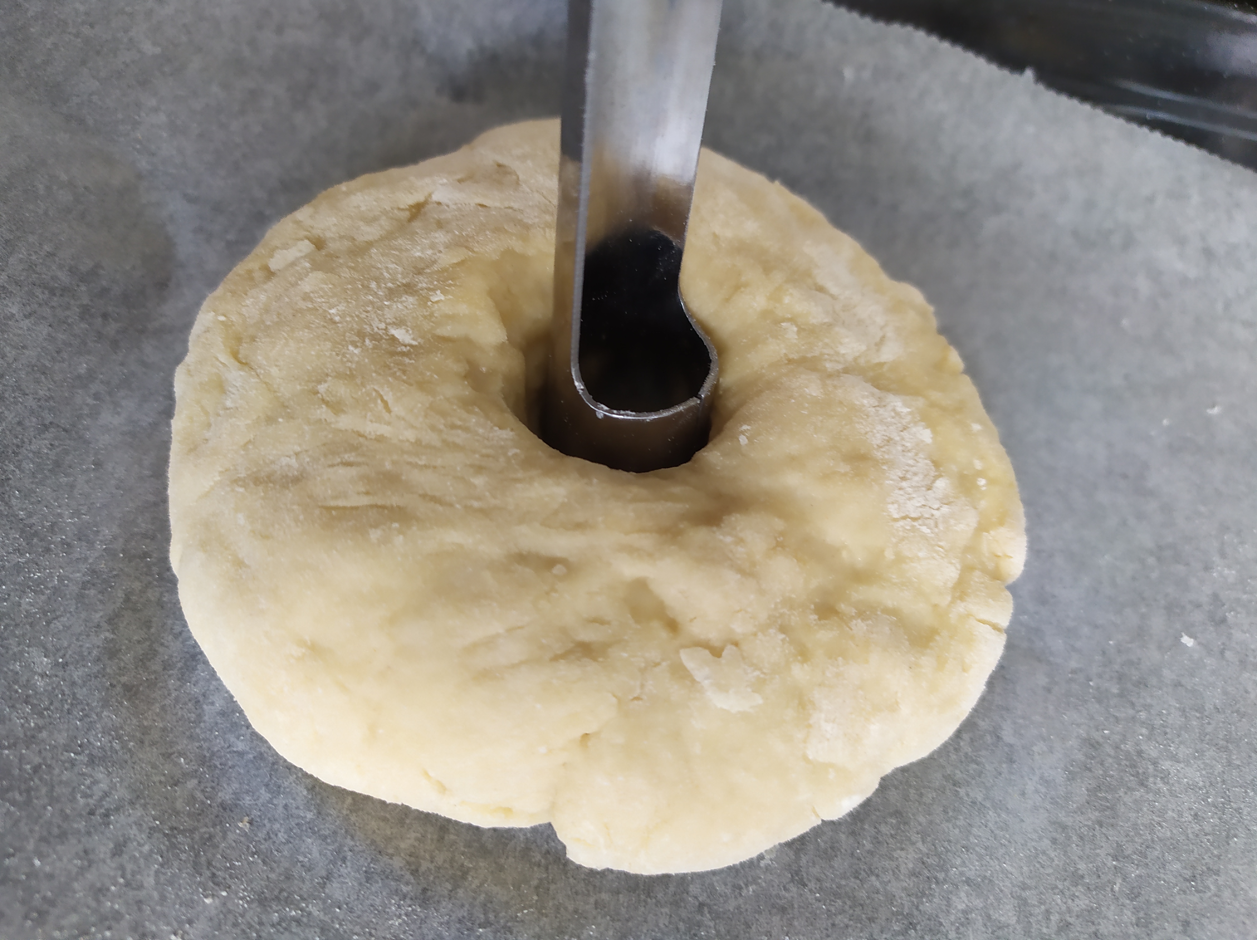 -agujereamos el centro (podemos utilizar un descorazonador de manzanas, un cortador pequeño o un vaso de chupito). Hay que tener en cuenta que la masa vuelve a crecer y el agujero de hace más pequeño