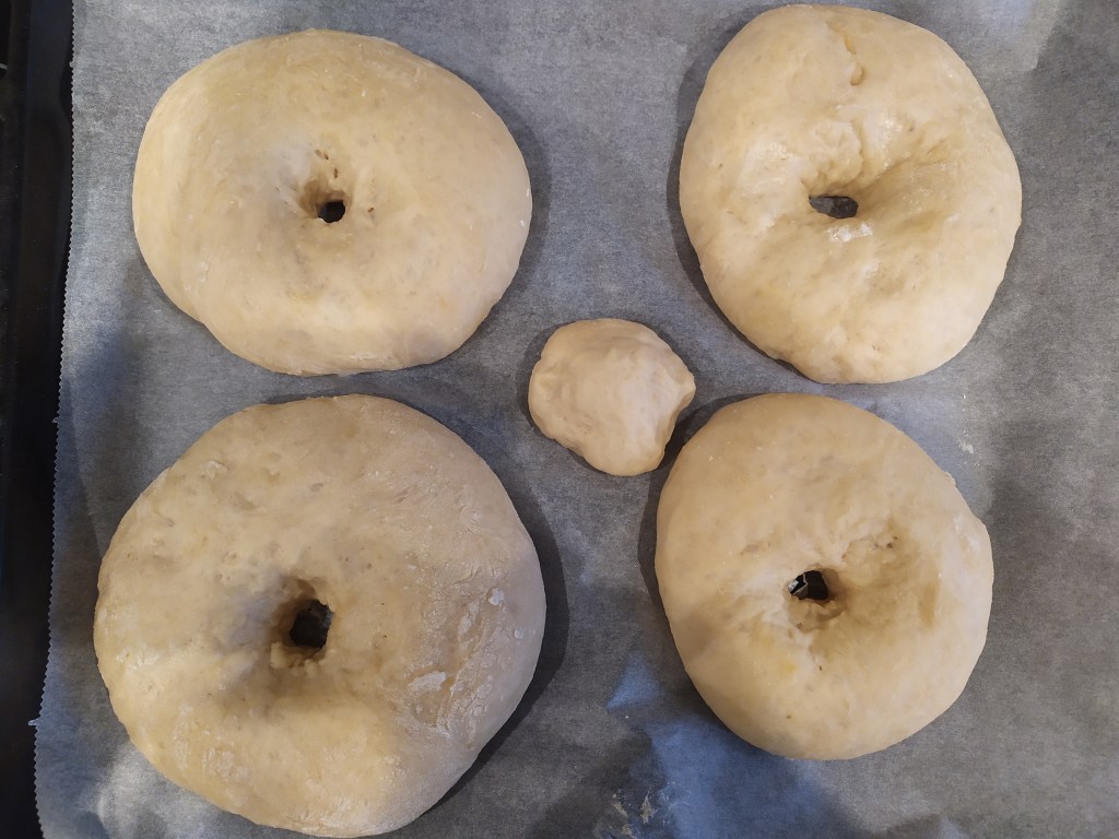 -cuando el agua hierva, colocamos con mucho cuidado y con la ayuda de una paleta grande plana los bagels de uno en uno en la olla (30 segundos por cada lado). Veréis que flotan y es fácil darles la vuelta en el agua con la ayuda de la paleta. Se quedan como arrugados, pero es normal