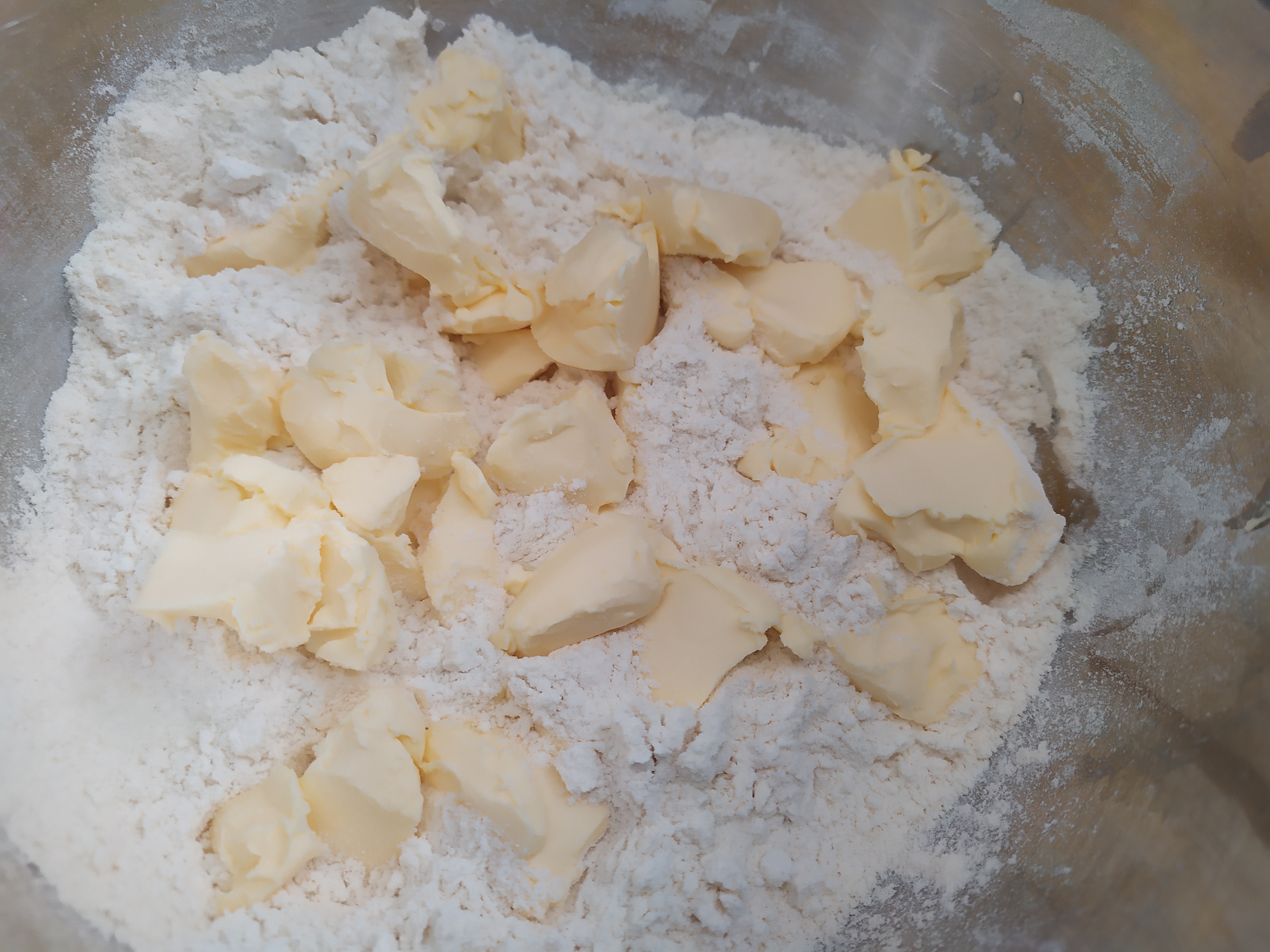 -colocamos en un bol la harina tamizada con una cucharadita de sal y añadimos la mantequilla bien fría partida a daditos
