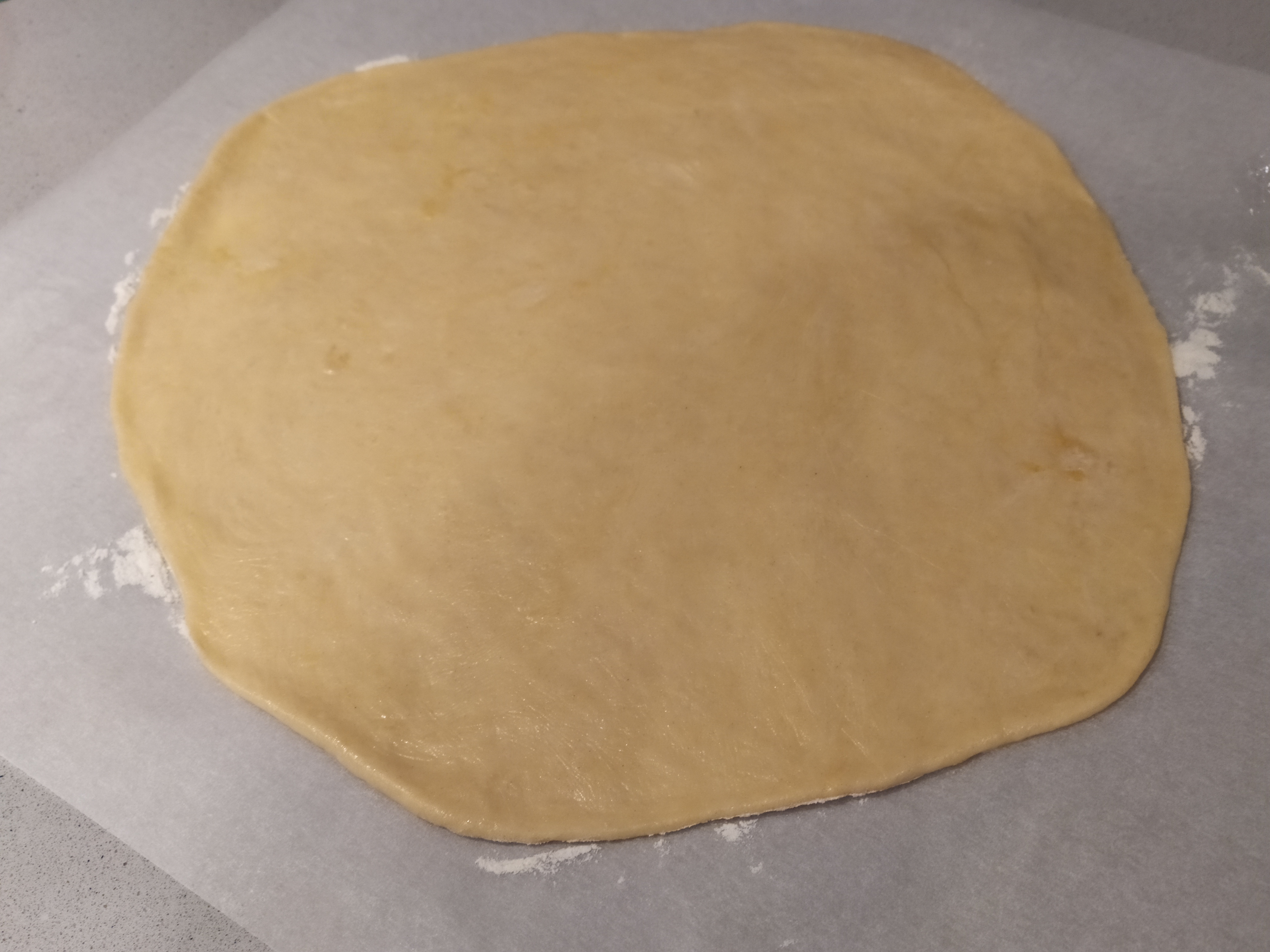 -pasadas unas horas, sacamos la bola y la estiramos encima de un papel de horno enharinado para que no se nos pegue (la podemos dejar estirada o colocarla en un molde de quiche o tartaletas previamente untadas con aceite y un poco de harina espolvoreada, para que no se pegue la masa)