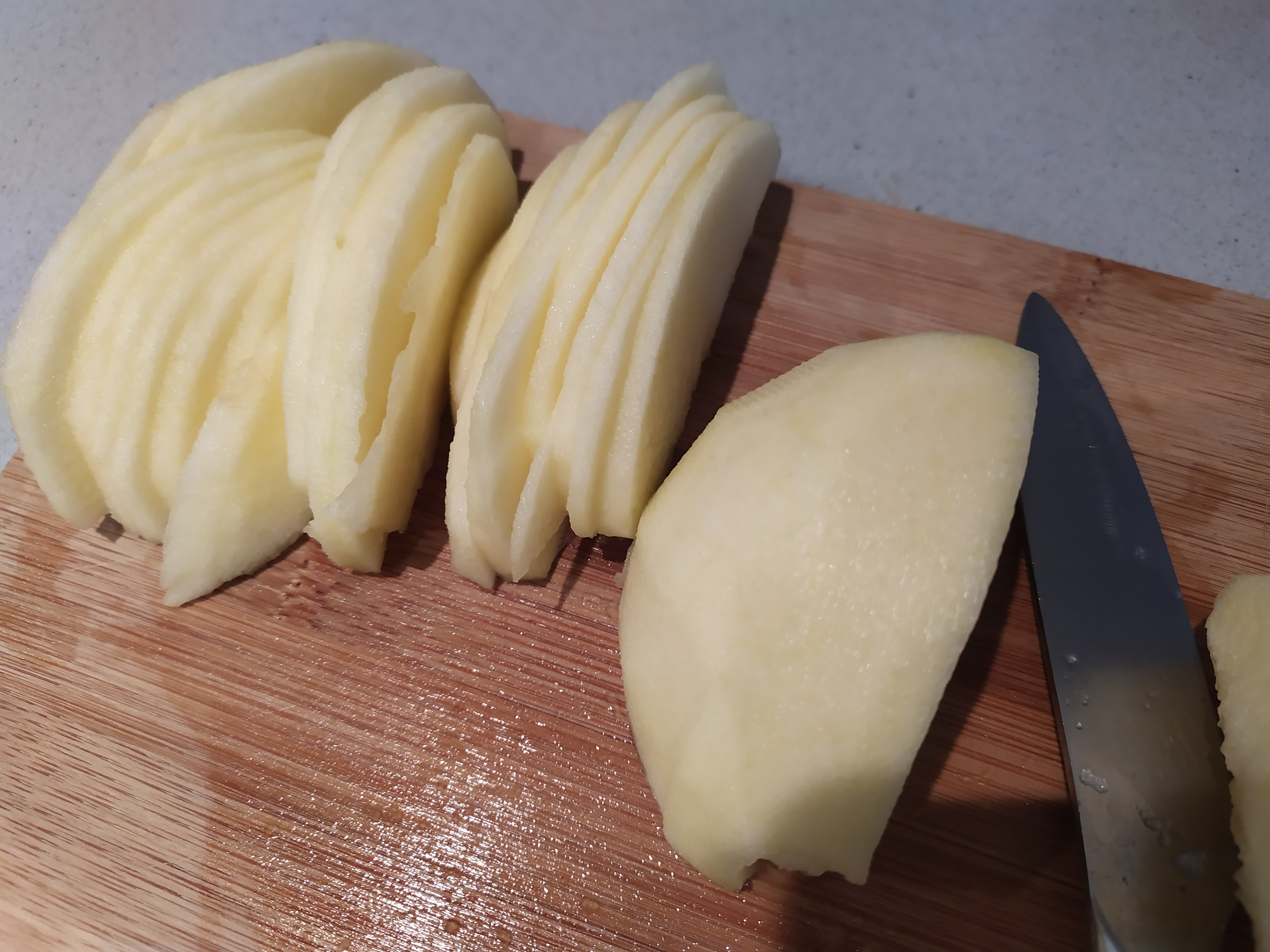 -mientras reposa y se enfría la masa, vamos preparando la cobertura. Empezamos pelando y descorazonando las manzanas, que laminaremos finitas para esparcirlas bien sobre la masa. Les añadimos unas gotitas de limón para que no se oxiden