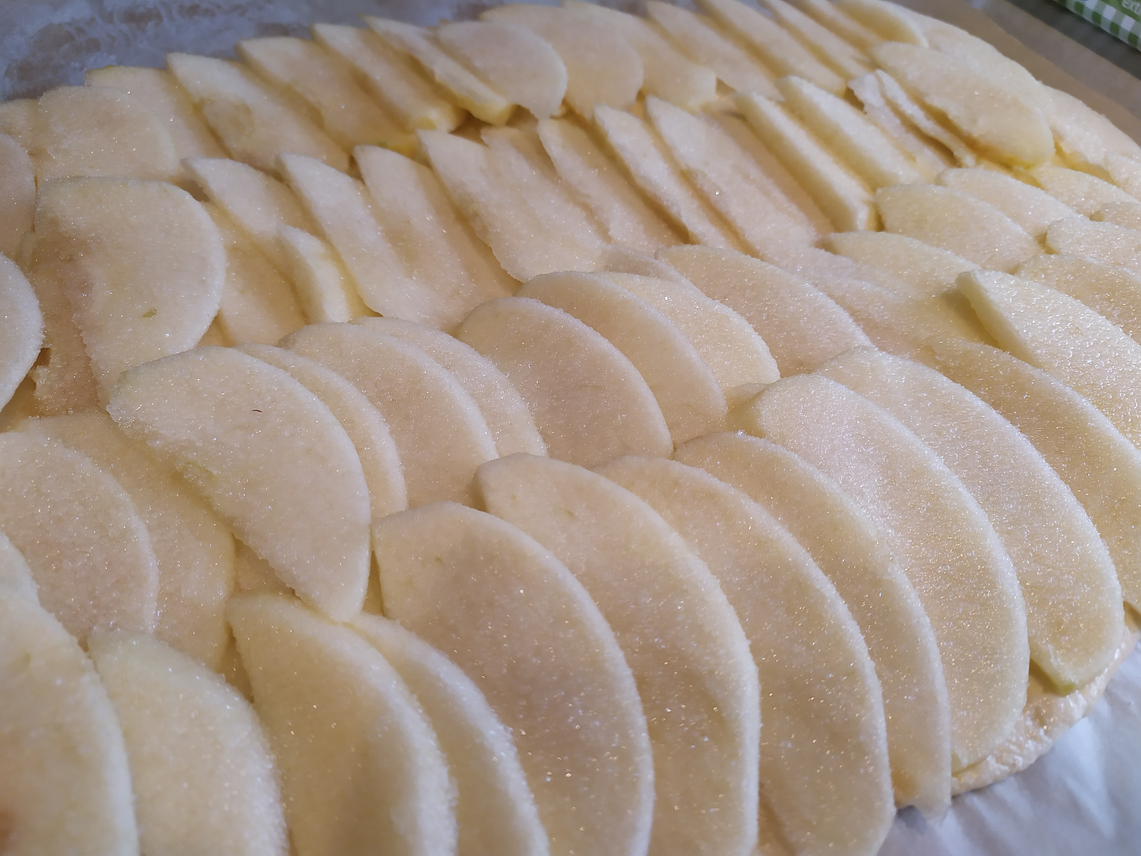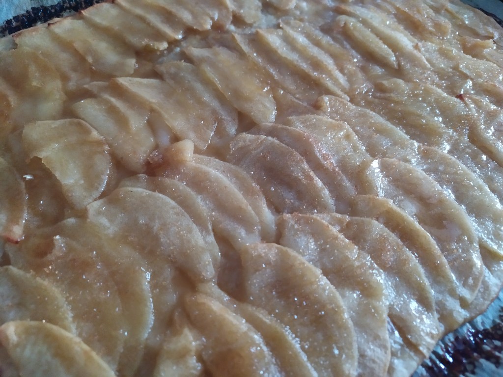 -vamos colocando las láminas de manzana encima un poco superpuestas entre sí y espolvoreamos un poco de azúcar blanco