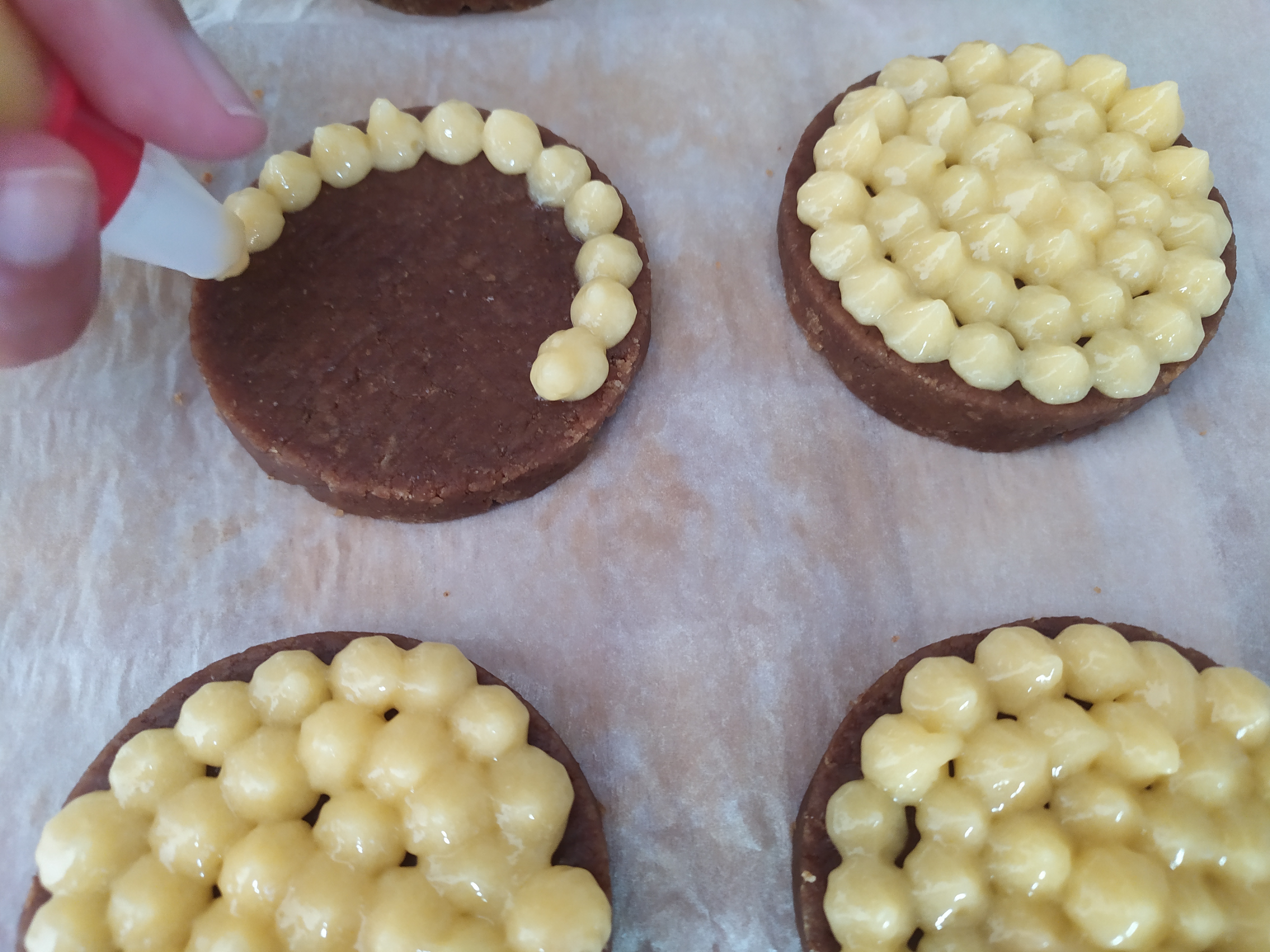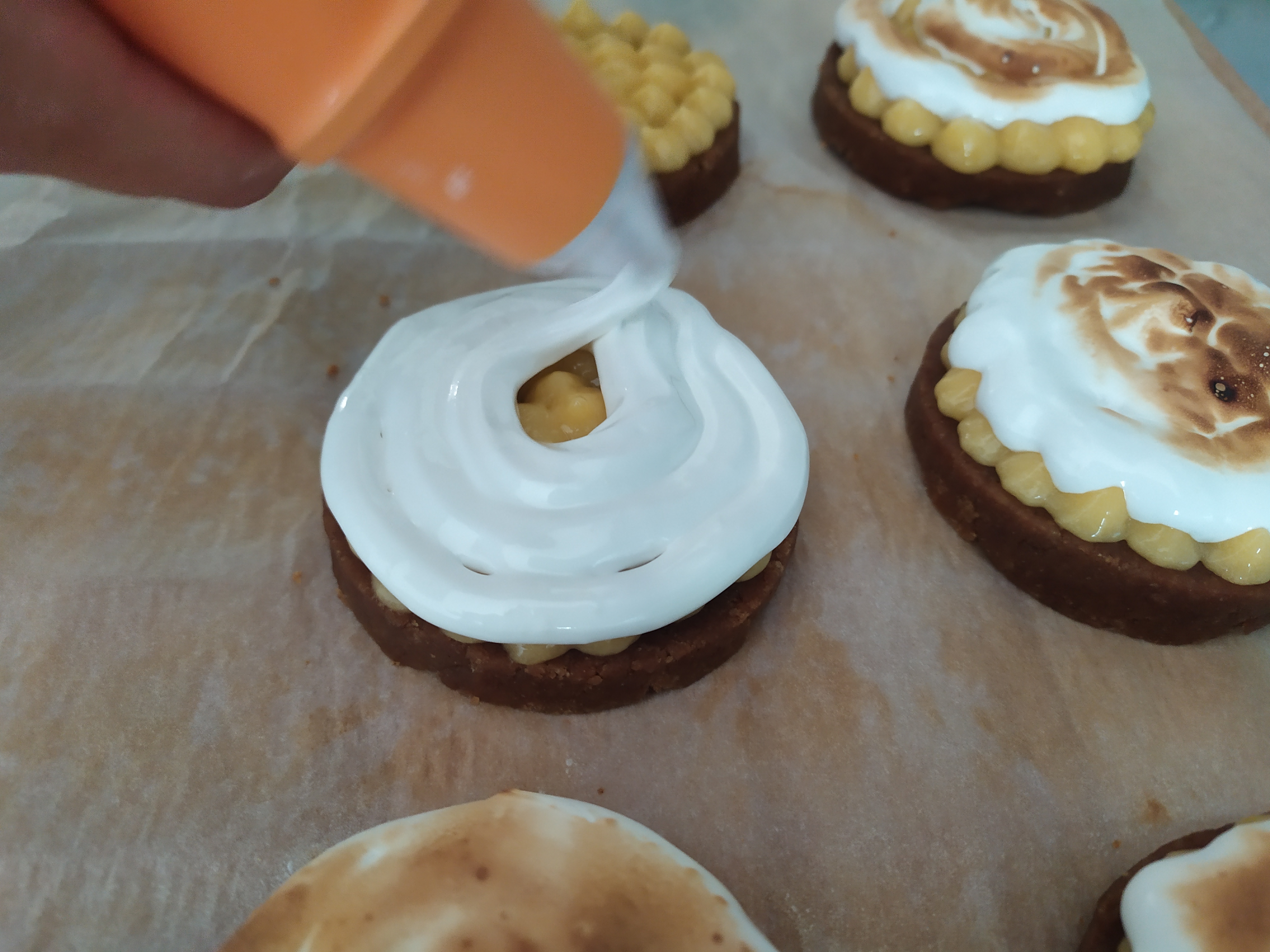 -colocamos el merengue en una manga pastelera y lo dejamos reposar en la nevera mientras colocamos la capa de lemon curd encima de la base