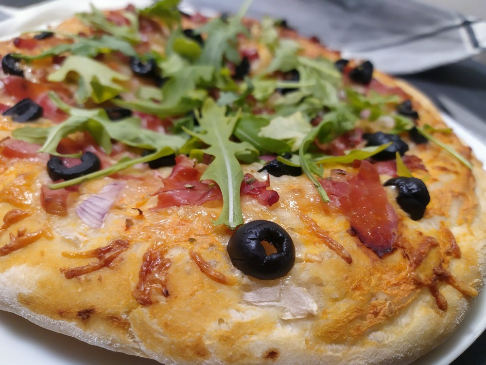 La otra noche nos tocaba pizza para cenar y decidimos preparar la masa en casa. Ha quedado buenísima, como cuando hacemos el pan, ya que los ingredientes son los mismos. Os copio la receta que seguimos por si algún día la queréis hacer, os lo recomiendo. Con estas cantidades salen dos pizzas generosas. Nosotros hicimos una para Rafa y otra para mí, ya que nos gustan con diferentes ingredientes. Además, yo prefiero la masa gorda, así que a la hora de estirarla lo hicimos con la mano, en lugar de con un rodillo, para que quedara con más grosor, pero eso va a gustos. Si preferís masa fina, la podéis estirar más. Nosotros la hemos dejado reposar en dos ocasiones: una recién preparada la masa, en forma de bola tapada en un bol, y luego una vez ya estirada para que volviera a crecer. También hay que tener en cuenta que luego, cuando se hornea también crece un poco.