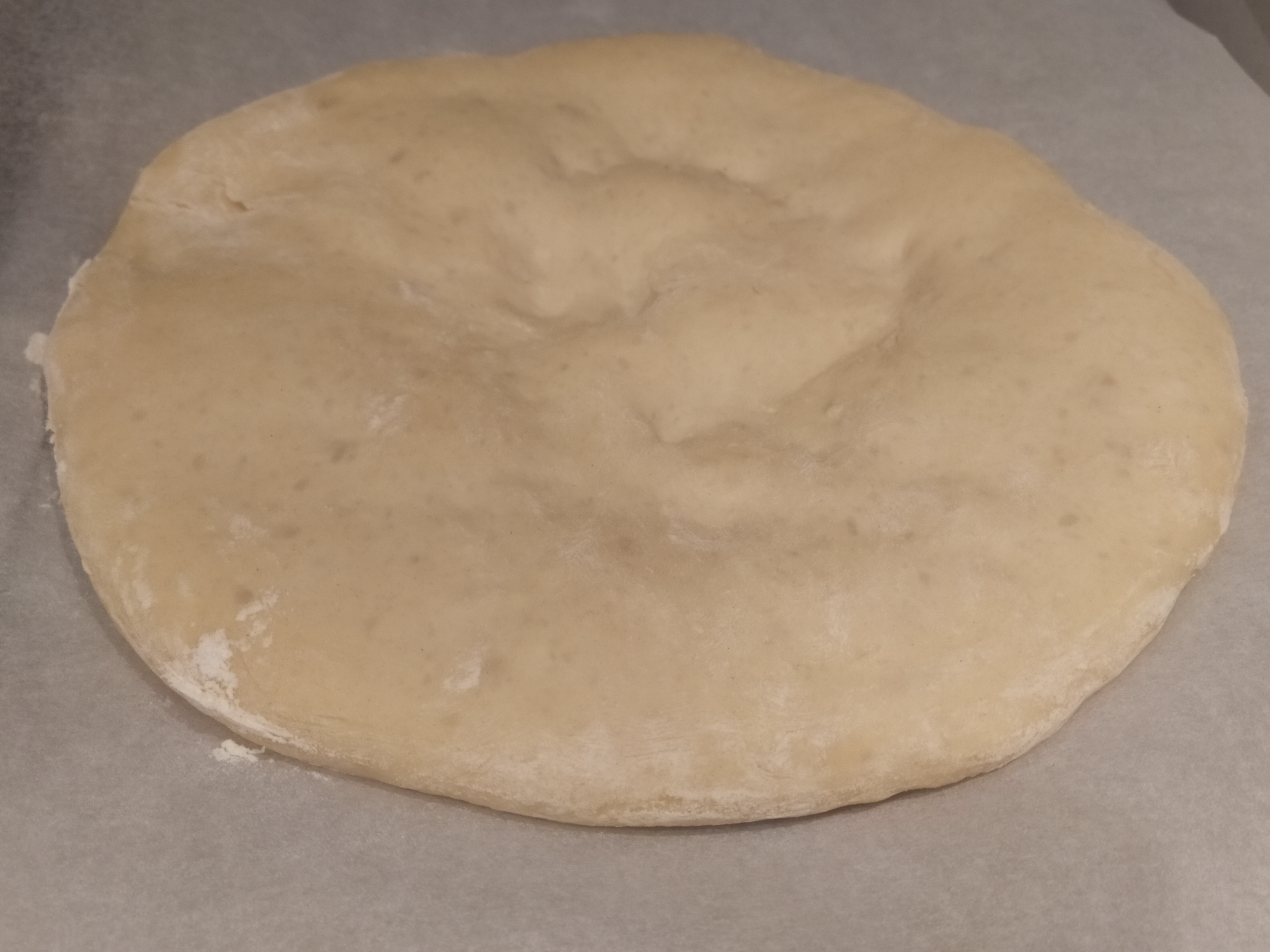 -cuando la masa crezca, la dividimos en dos si queremos hacer pizzas individuales o dejamos solo una bola, que estiramos sobre una superficie enharinada, para que no se pegue, y la volvemos a dejar reposar (le damos el grosor deseado, teniendo en cuenta que crecerá un poco más)