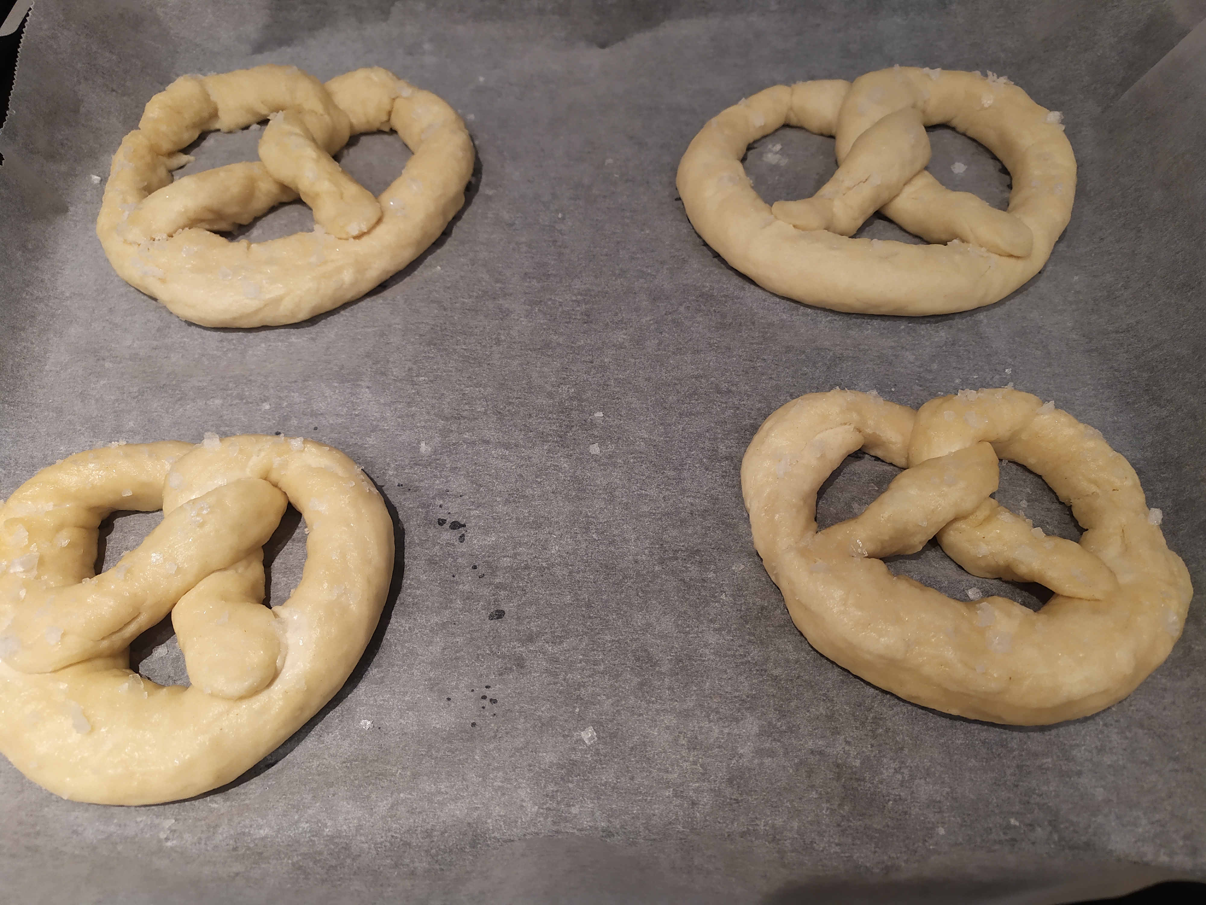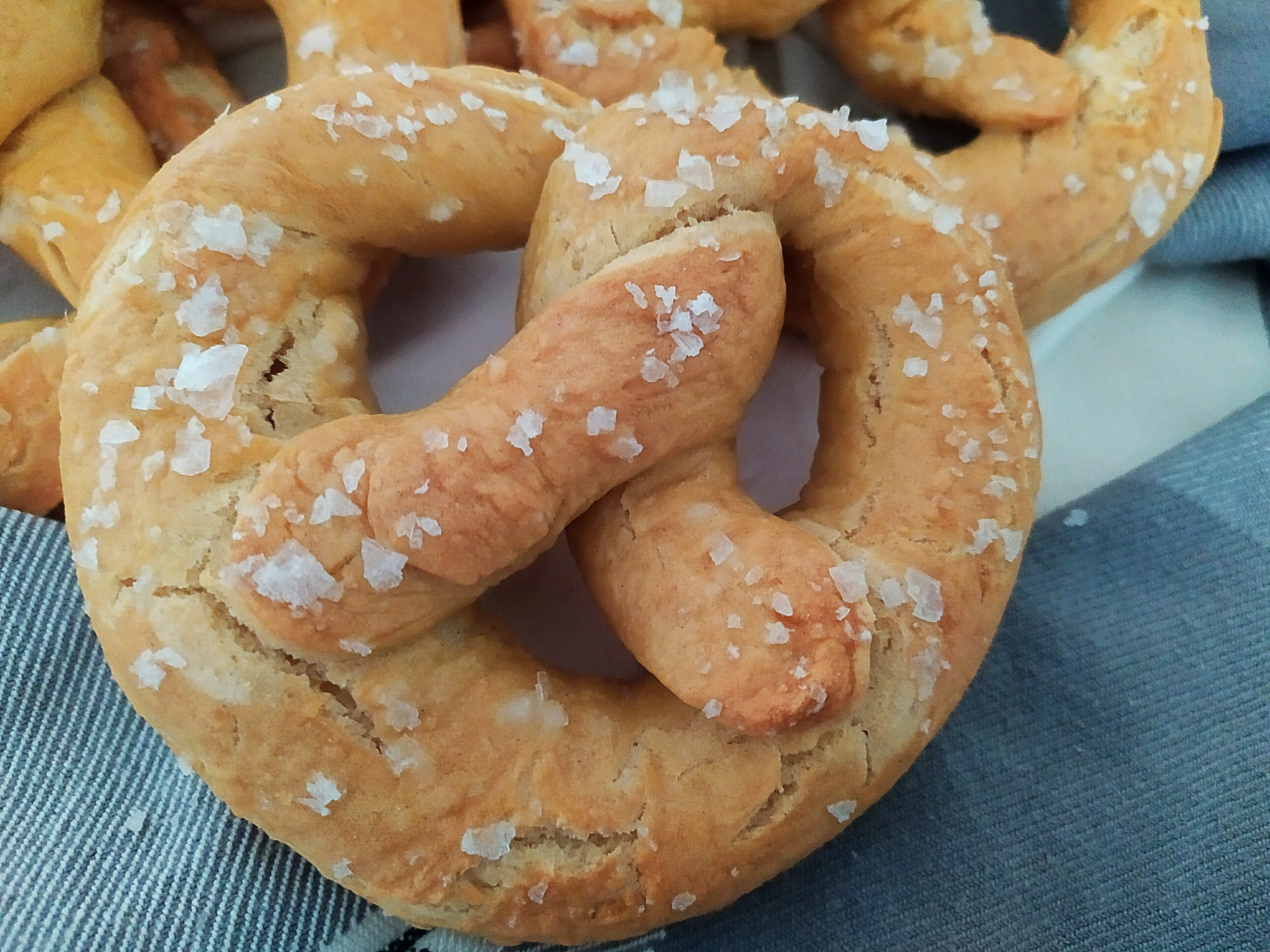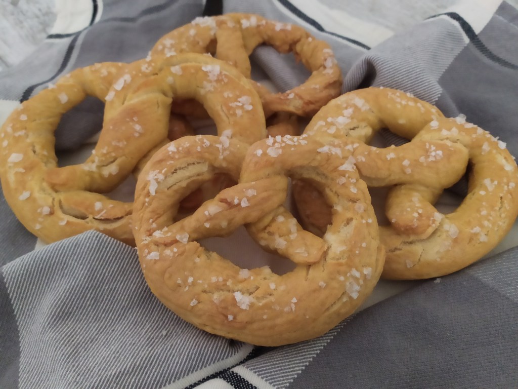 Hace unos años, cuando Rafa y yo viajamos a Berlín, en una de las excursiones que hicimos a Potsdam, paramos a desayunar en una pequeña cafetería al lado de la estación de tren. En esa parada nos pedimos unos panecillos en forma de lazo de color marrón oscuro con sal por encima, que no sabíamos cómo se llamaban, pero que tenían muy buena pinta y nos llamaron la atención. Descubrimos que eran bretzels y son unos panecillos horneados retorcidos en forma de lazo, con un sabor ligeramente salado originarios de Alemania. Los hemos hecho un par de veces en casa y nos encantan. Al igual que los bagels, también se hierven antes de hornear, pero es lo que les da un toque diferente, así como la sal en escamas que se le añade por encima.